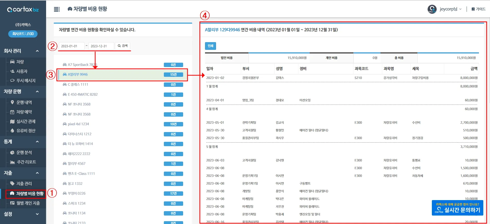 3. 차량 선택 | 비용 내역을 확인할 차량을 선택합니다. |