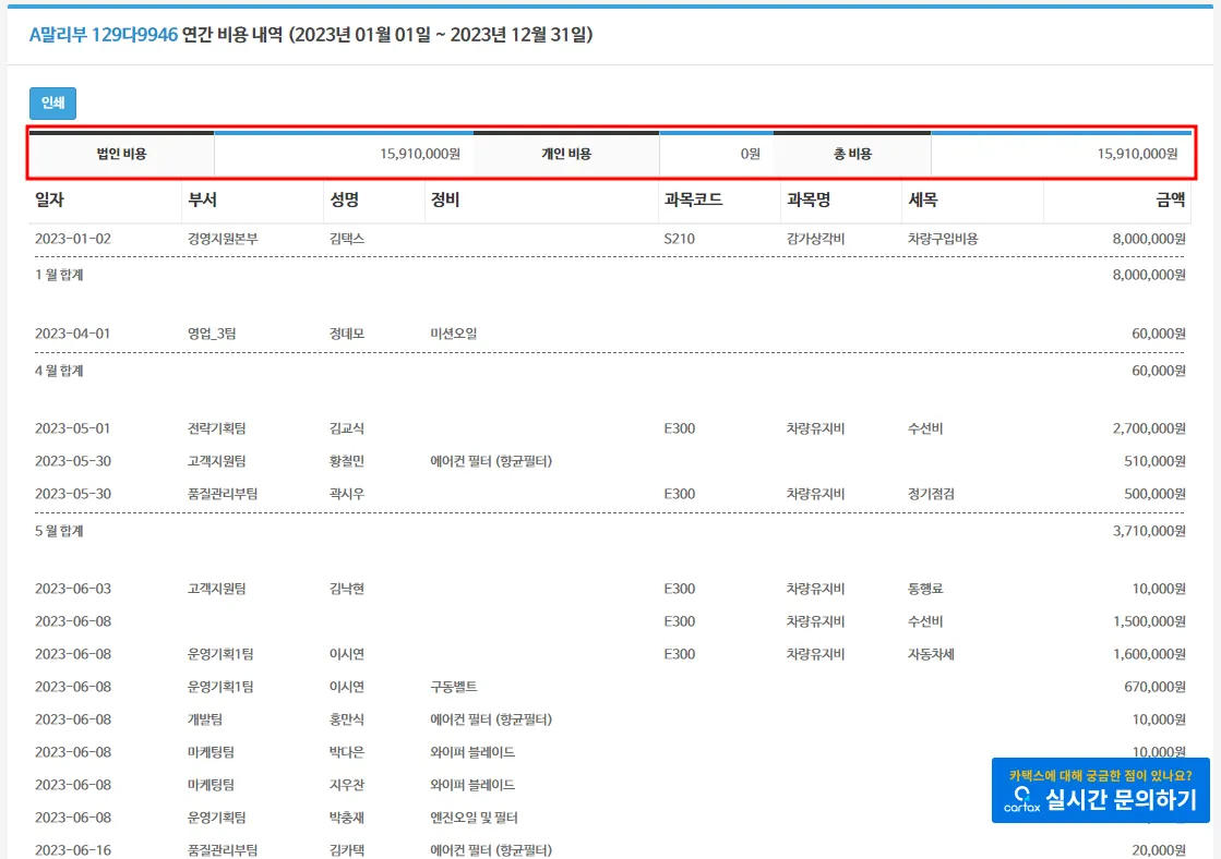 업무용 차량의 비용처리를 위해 비용 세부 내역 및 총 비용 합계를 확인할 수 있는 기능을 제공하고 있습니다.