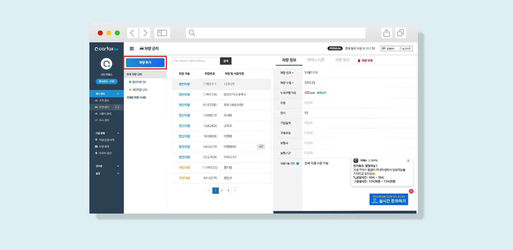 ① 관리자페이지 [회사 관리]→[차량]→[차량등록]버튼→법인 차량 추가
