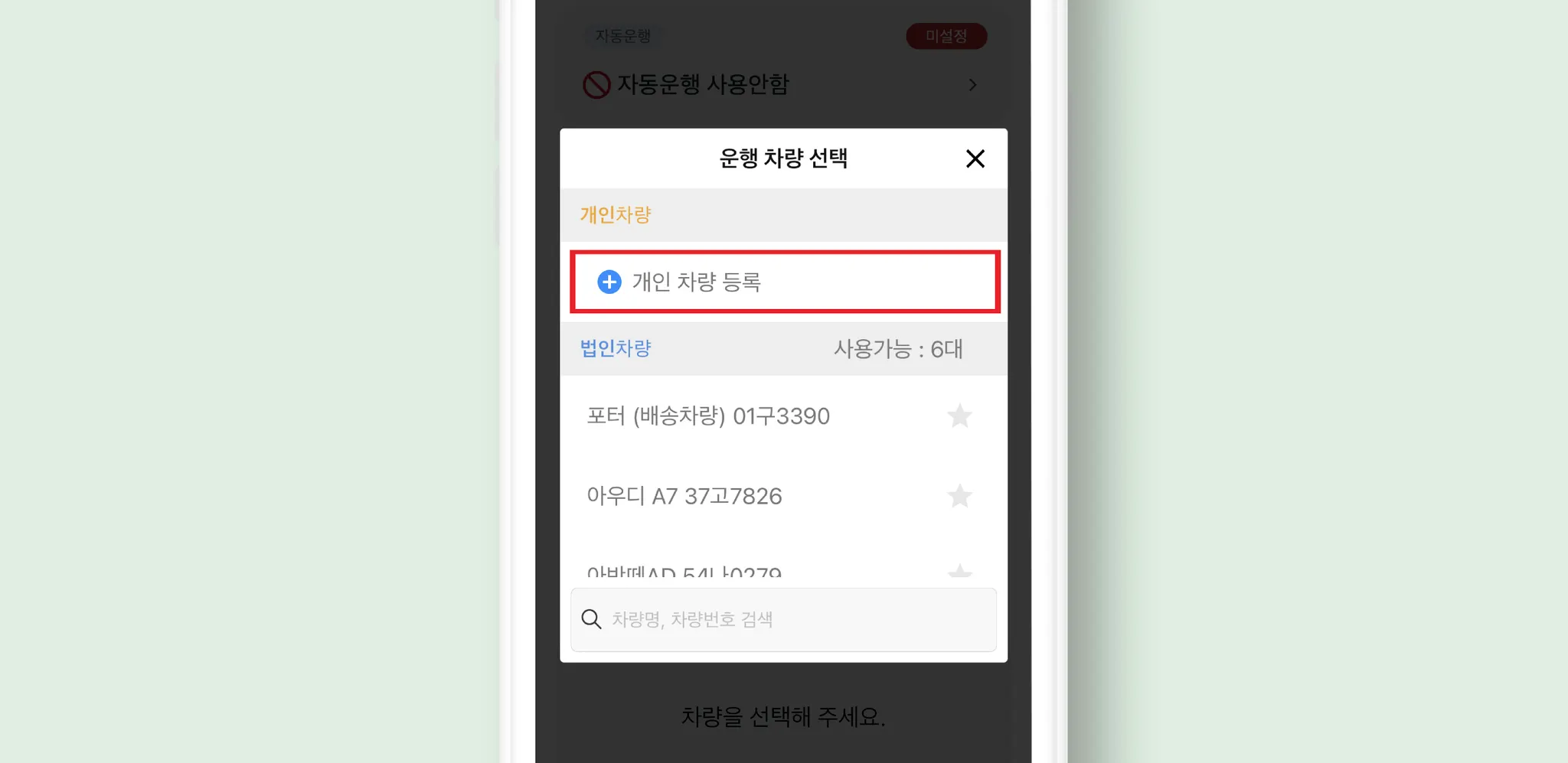 ② 앱에서 개인차량 소유직원이 직접 직접 개인차량 등록해주세요.