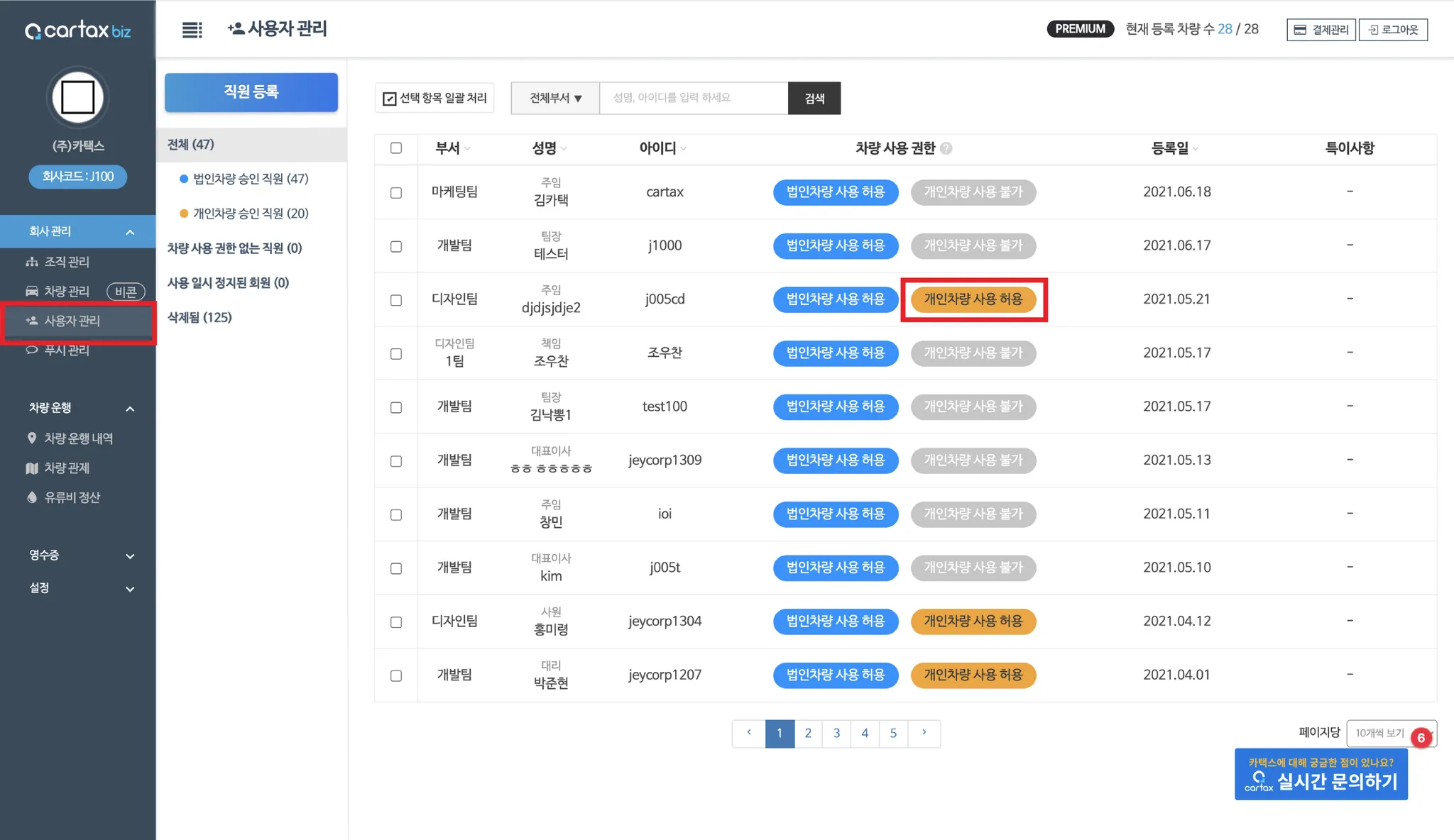 ① 관리자페이지의 [회사관리]메뉴→[사용자]페이지 에서 해당직원 개인차량 사용 허용을 선택해 주세요.