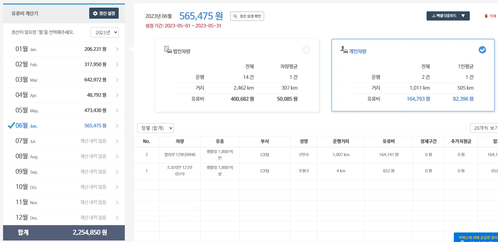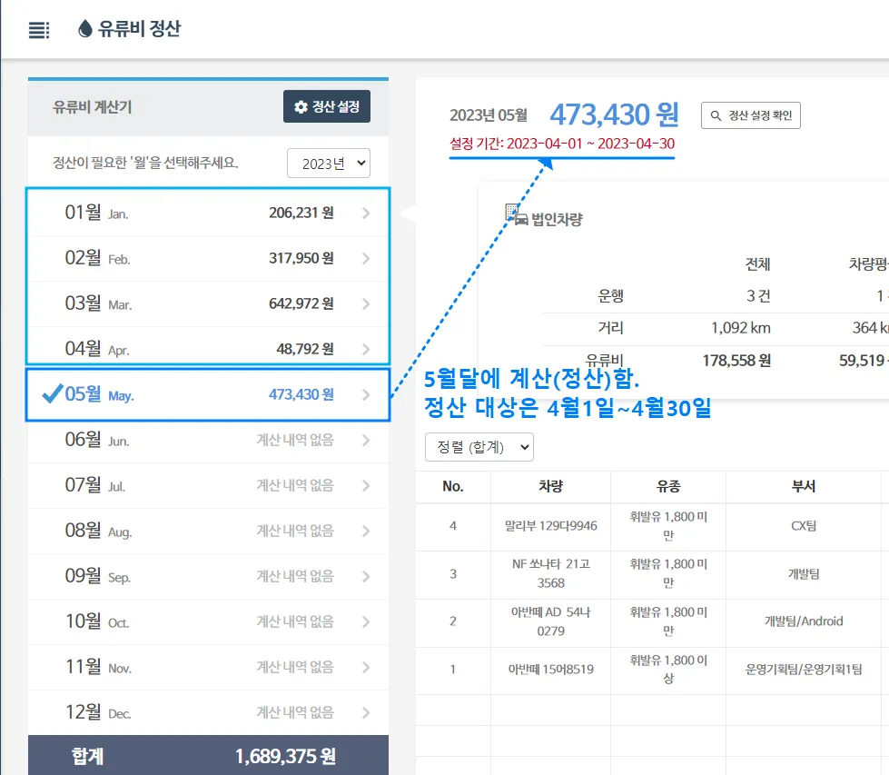 계산이 완료된 월이 있는 경우, 해당 월을 선택하면 화면 오른쪽에 계산(정산)된 유류비 내역이 표시됩니다.