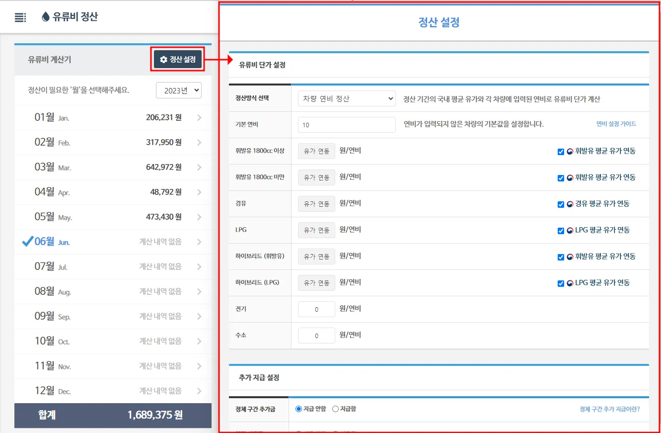 유류비를 계산하기 전 [정산 설정] 버튼을 클릭하여, 현재 설정된 정산 방식을 확인하고 필요한 경우 변경합니다.