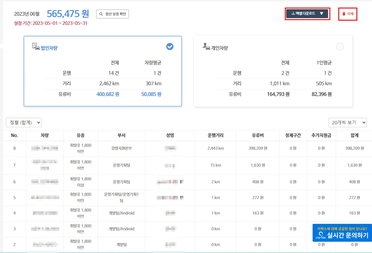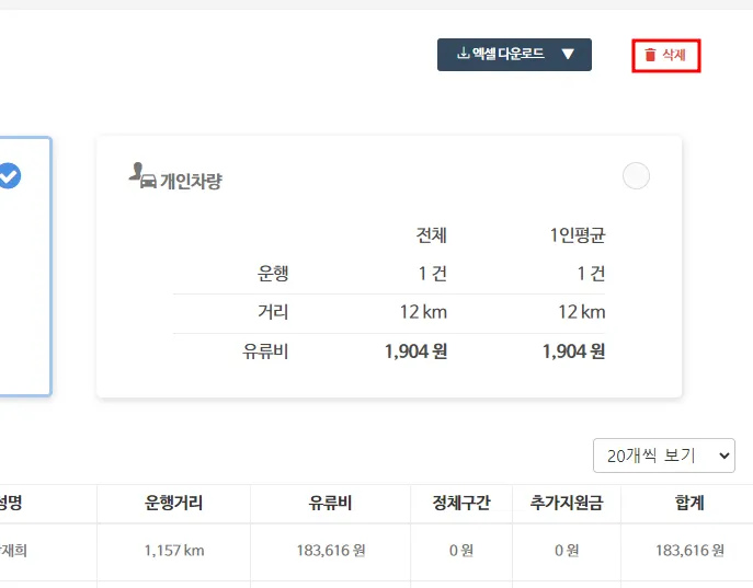 우측 상단의 [엑셀 다운로드] 버튼을 통해 유류비 내역을 다운로드 할 수 있습니다. 다시 계산하고 싶은 경우 우측 상단의 [삭제] 버튼을 클릭합니다.