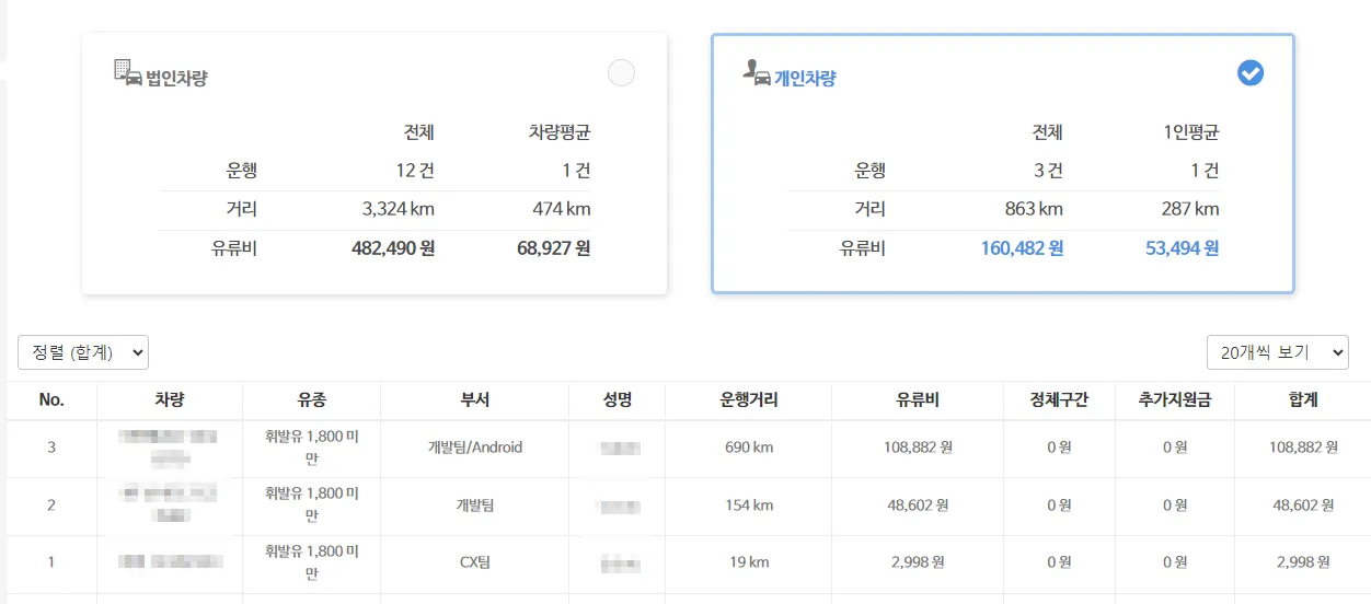 차량 및 사용자별 유류비 금액이 출력됩니다. (필요 시) [개인차량]에 해당하는 차량 및 사용자(직원)의 금액을 확인 한 후, 각 사용자에게 정산 지급합니다.