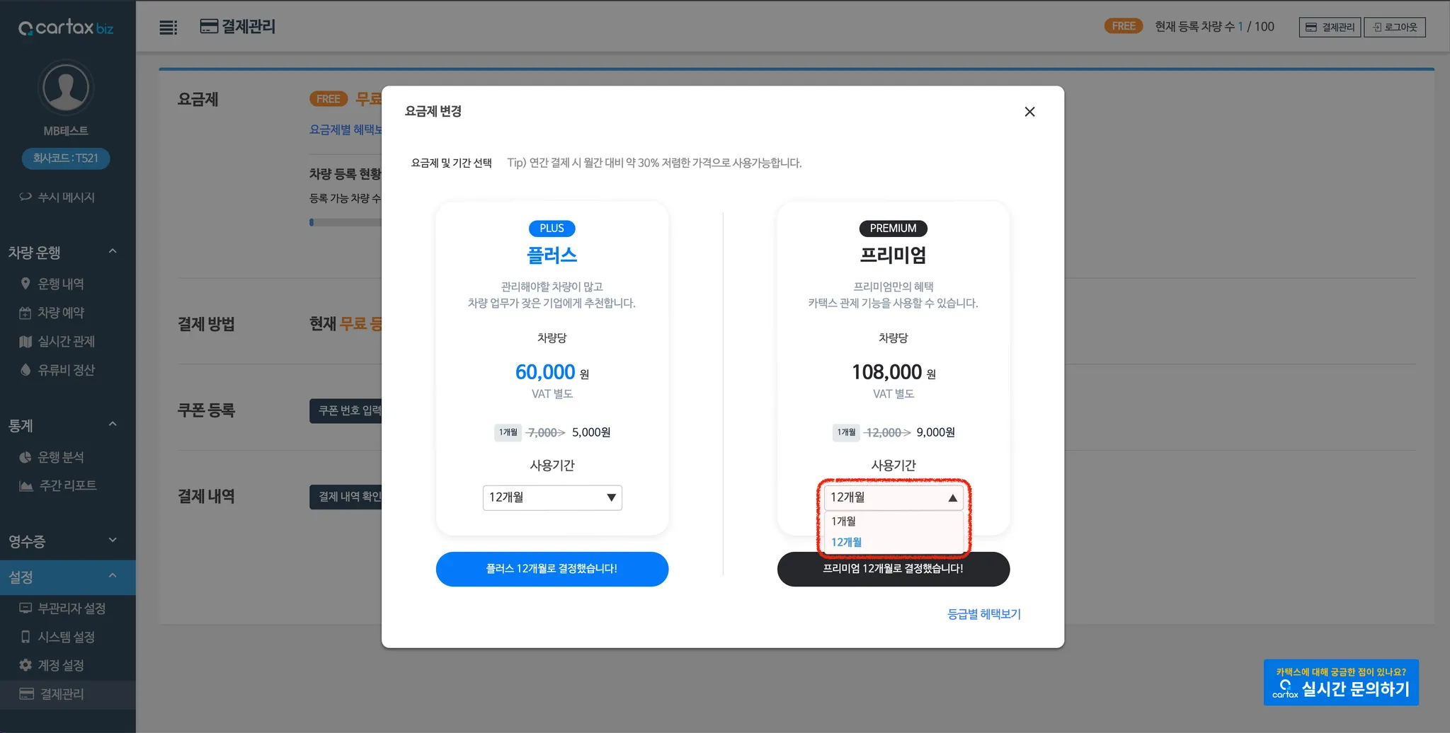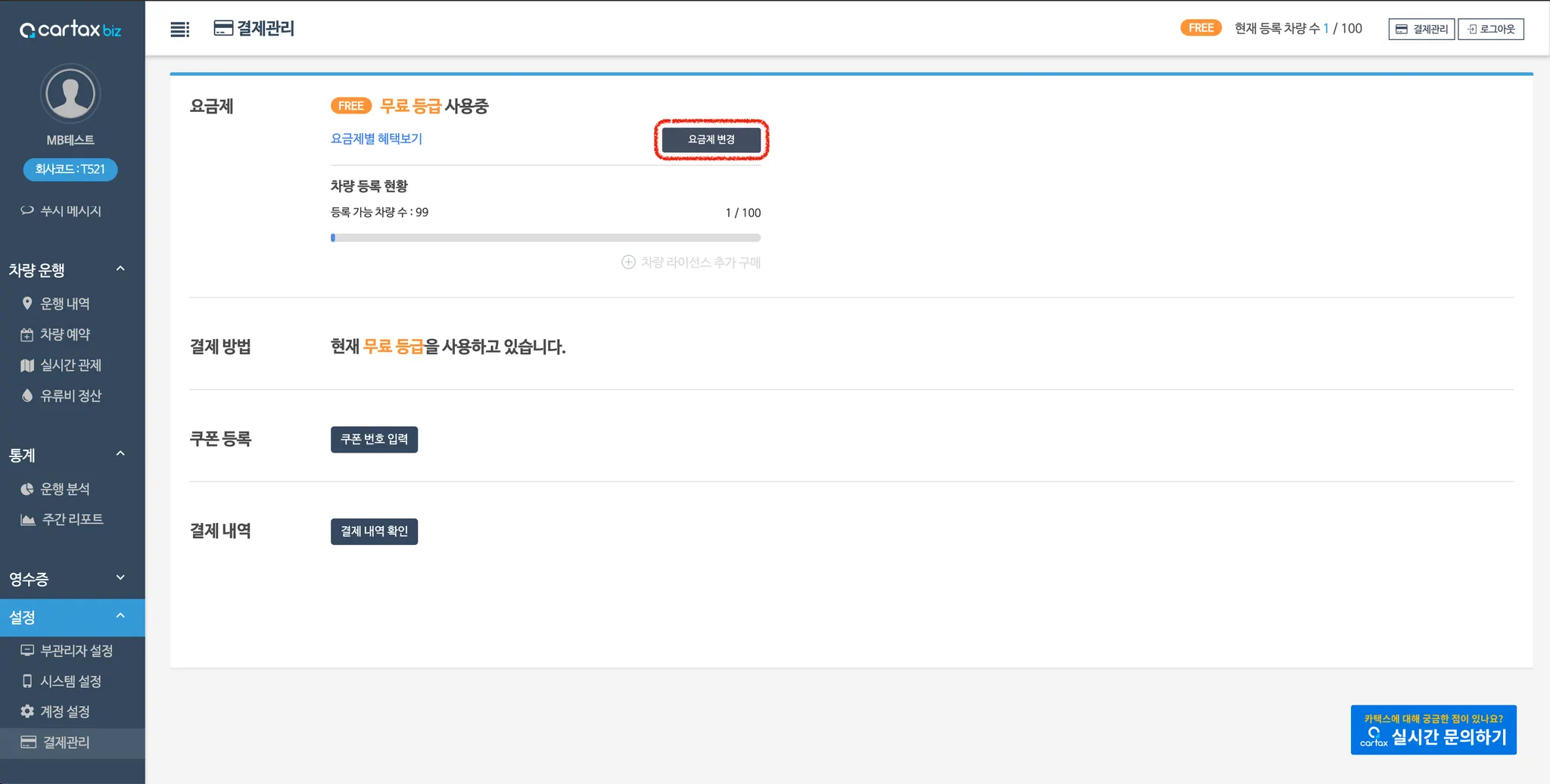 1. 카택스 결제 관리의 요금제 변경을 선택합니다. |