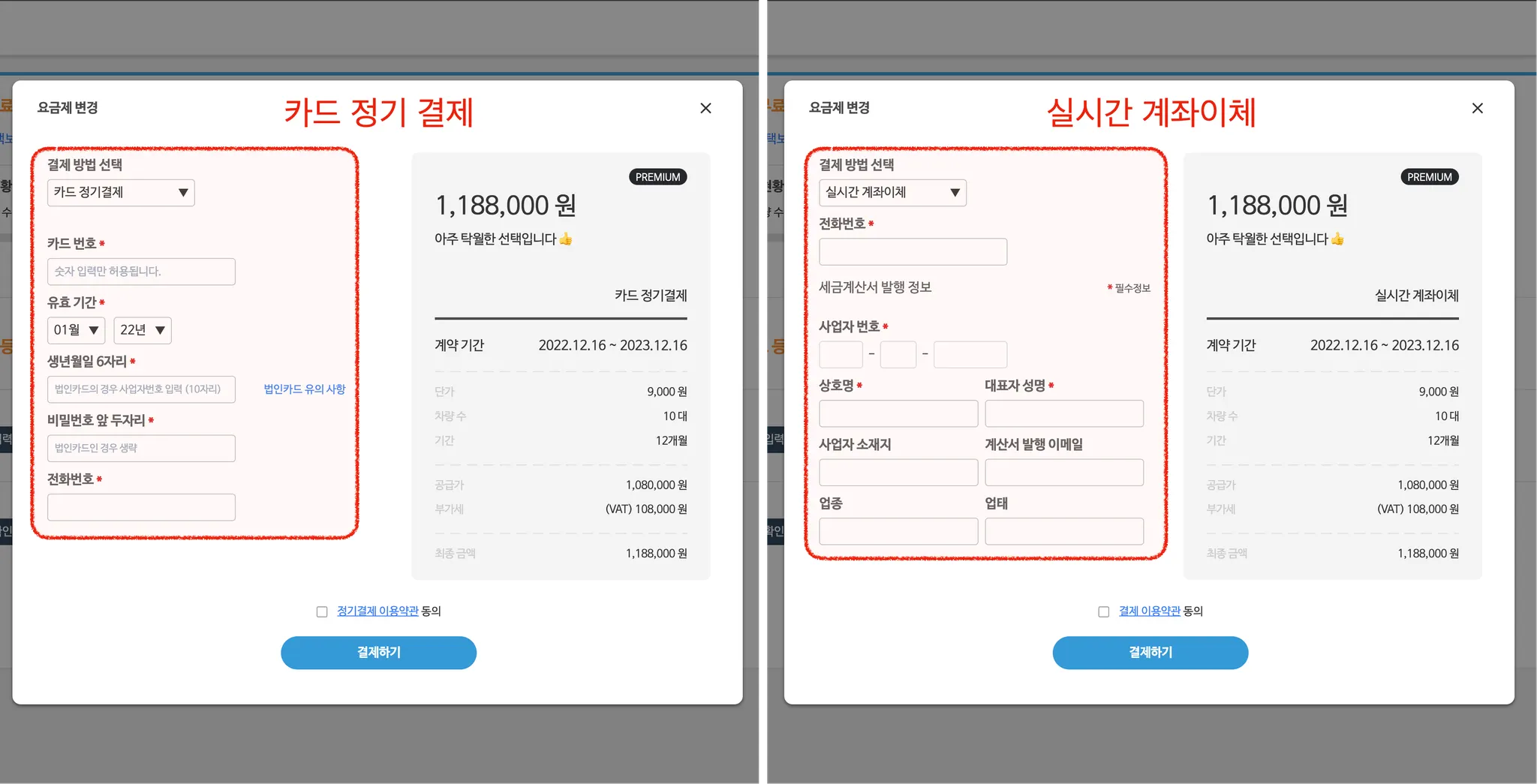 - 카드 정기 결제: 서비스 만료일에 맞춰 등록된 카드로 자동 결제됩니다.