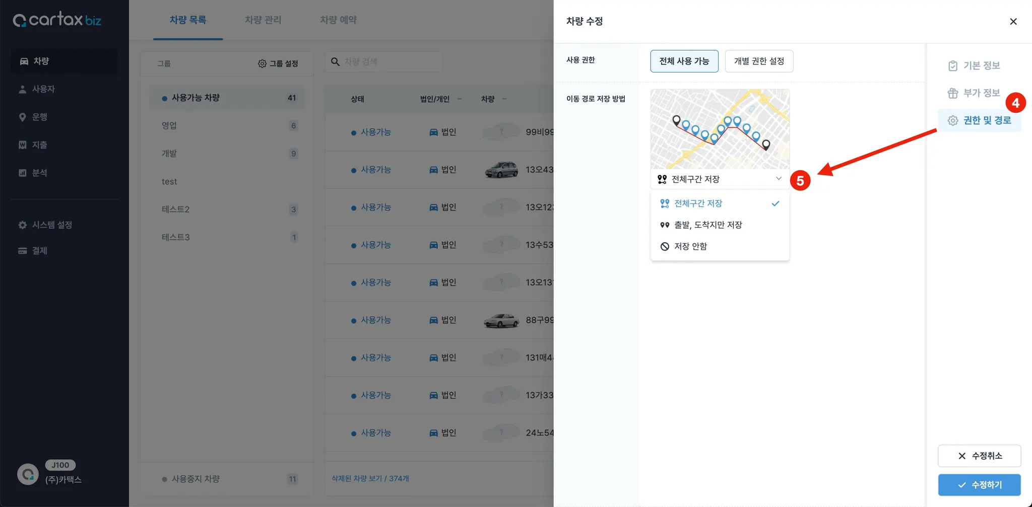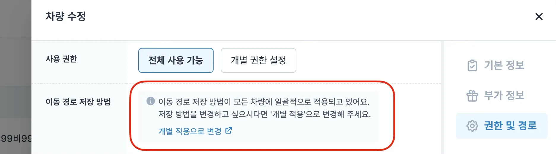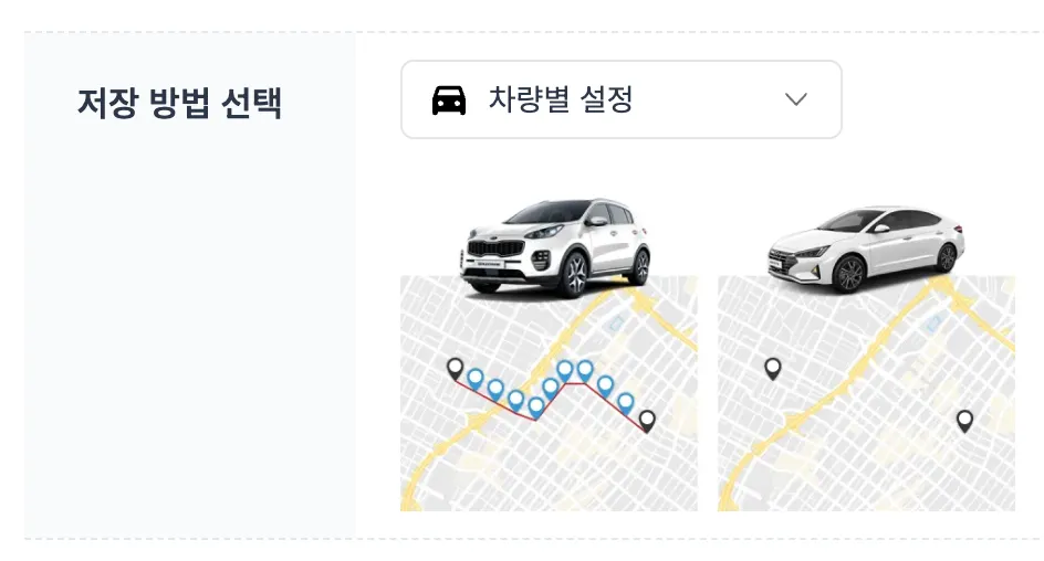 차량별로 이동 경로 저장 방식을 개별적으로 설정할 수 있습니다.