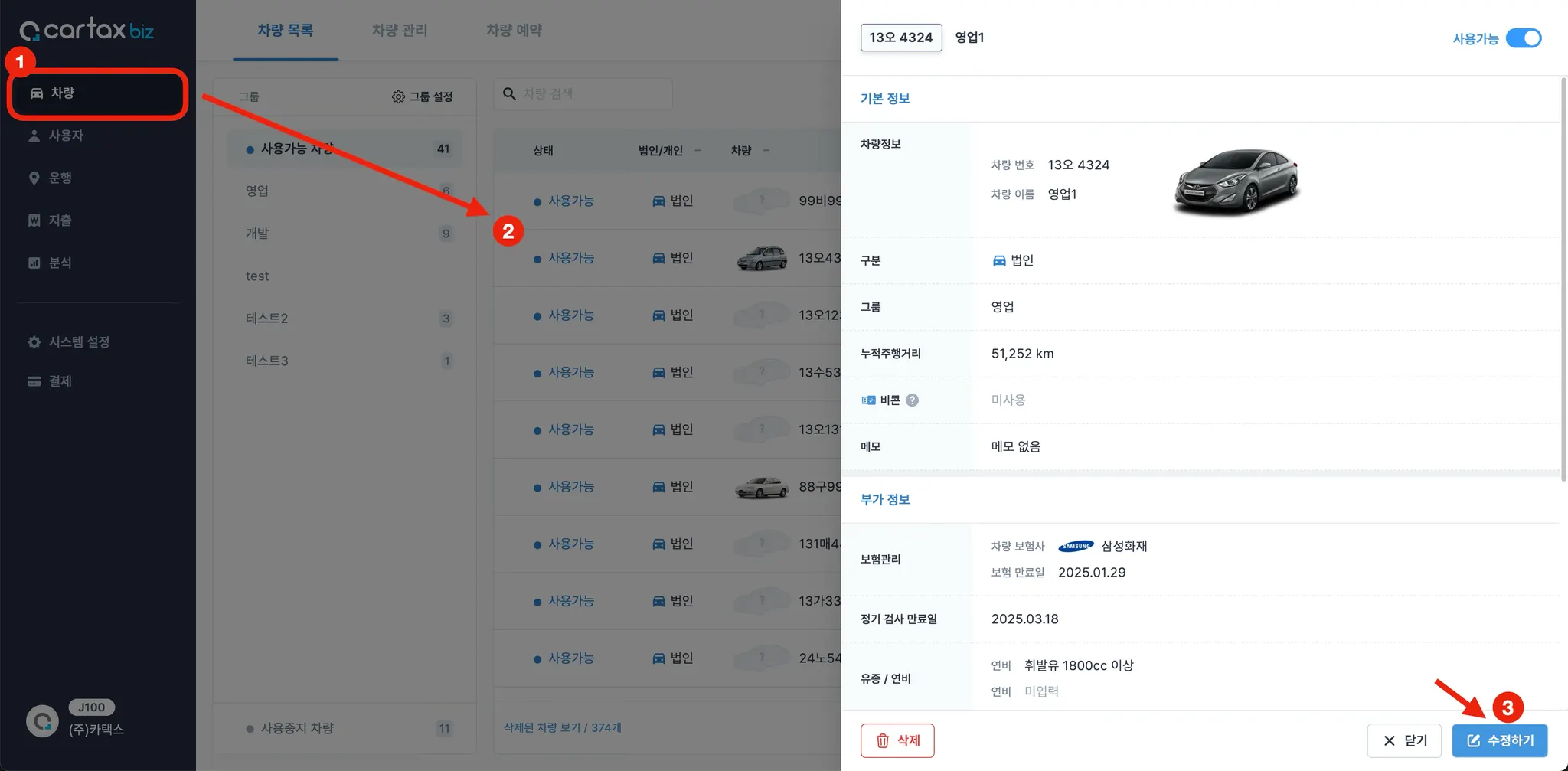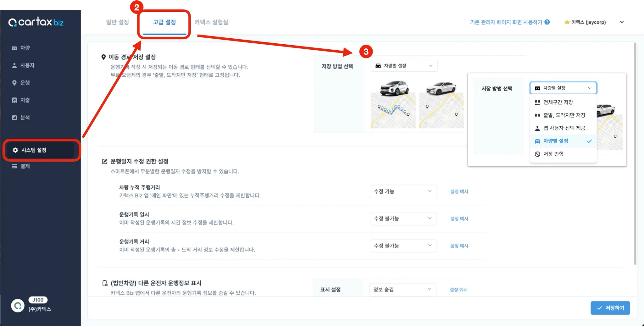 먼저 시스템에서 이동 경로 저장 방식을 ‘차량별 설정’으로 변경해야 합니다.