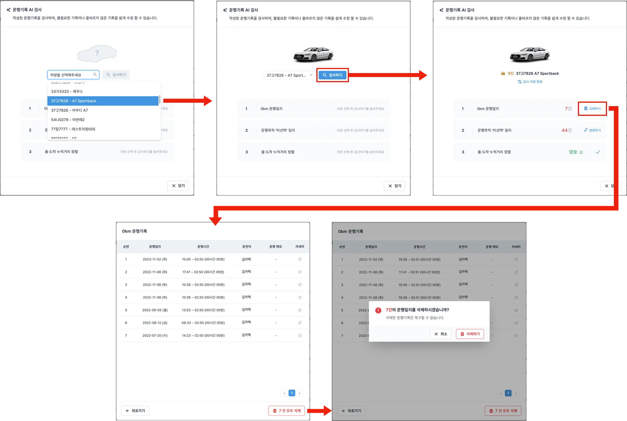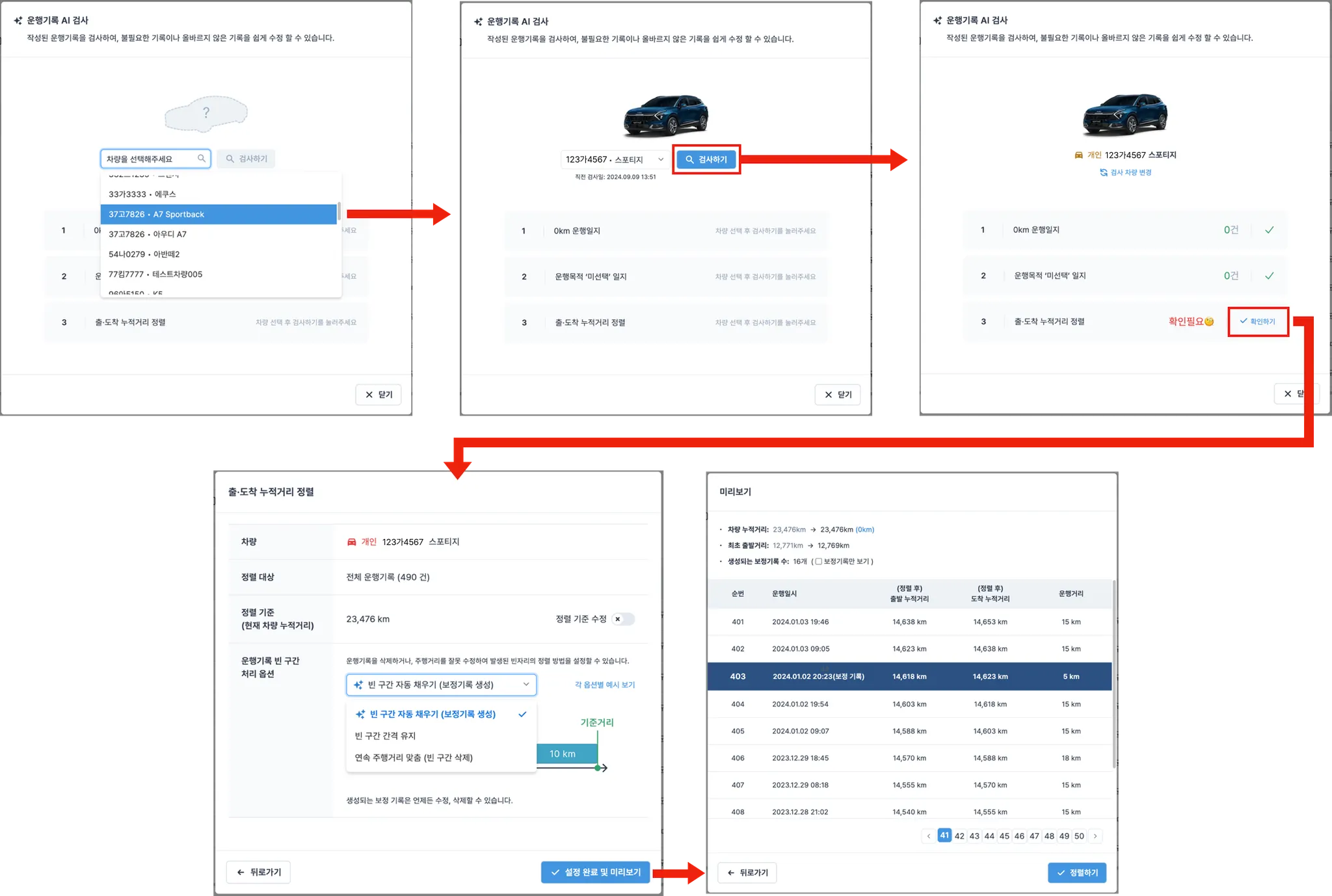 특히 운행기록을 삭제할 경우에는 삭제한 위치의 이전, 이후 기록의 출·도착 주행거리에 공백이 발생하게되며, 이 공백은 AI 검사를 통해 보정기록으로 만들거나, 정렬을 통해 맞춤 작업이 가능합니다.