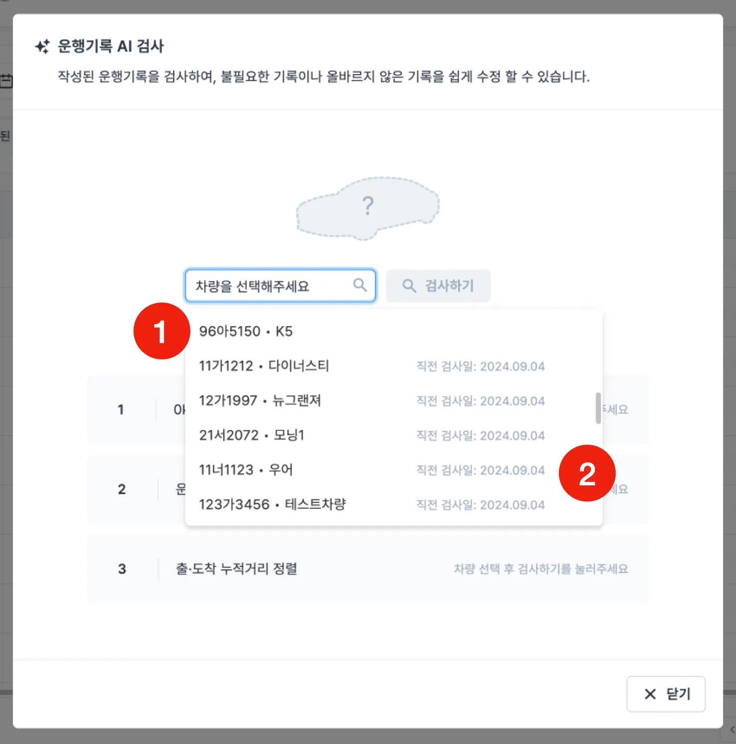 1 | 검사할 차량을 차량번호, 이름 등으로 검색하거나 목록에서 선택합니다. |
