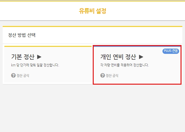 유류비정산 → 정산설정 → 개인 연비 정산 선택