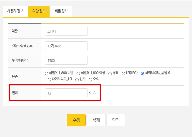 먼저, 사용자관리에서 - 연비 설정해주세요.
