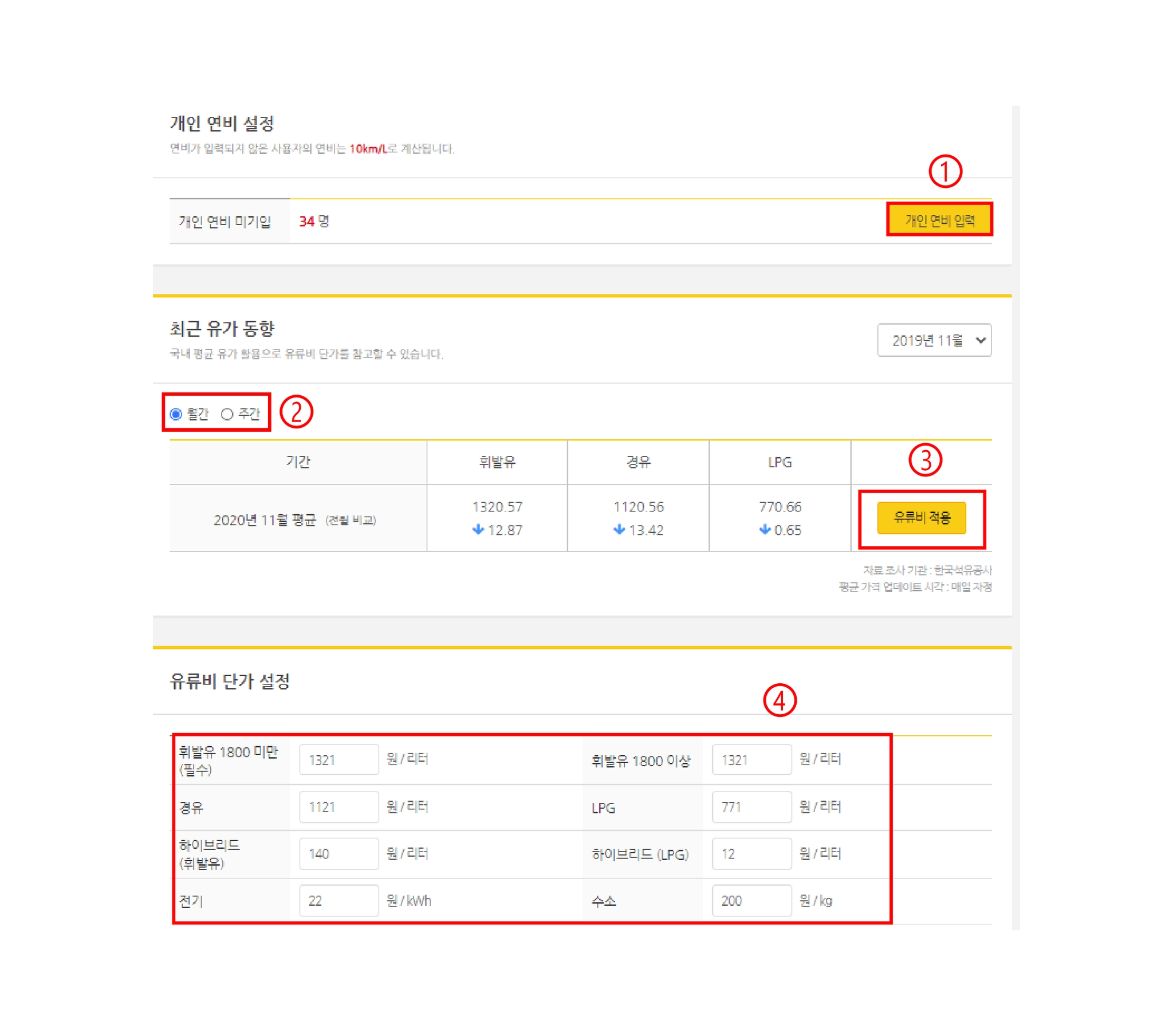 ① 개인 연비 입력 : 연비가 입력되지 않은 차량은 정산이 되지 않습니다.