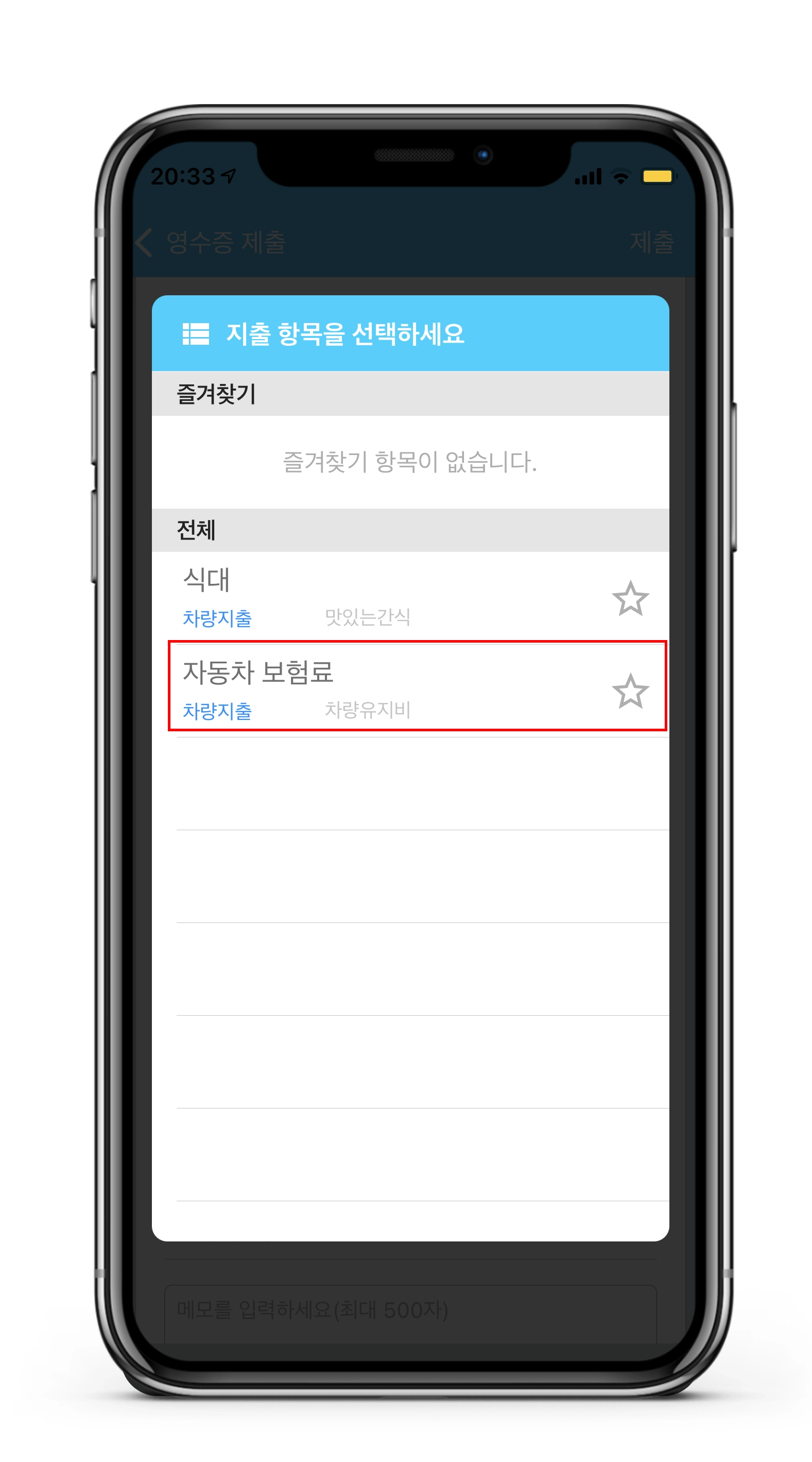 어플에서는 사용자는 세부항목을 선택하여 영수증을 제출하게 됩니다.