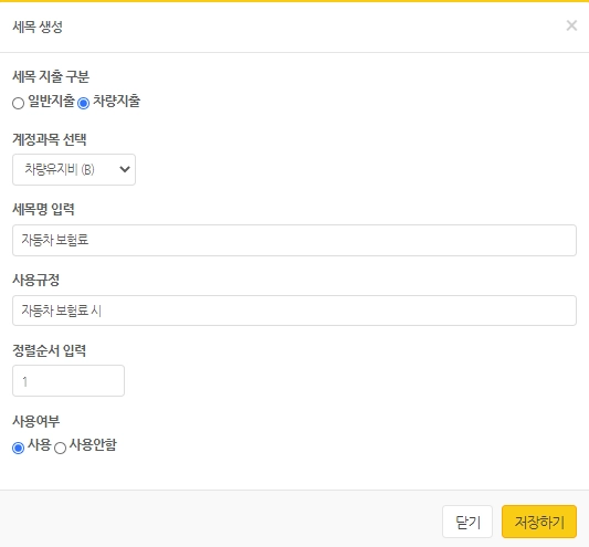 차량지출 또는 일반지출 안에 포함되는 계정항목을 추가하고, 계정항목 안에 세부항목 추가합니다.
