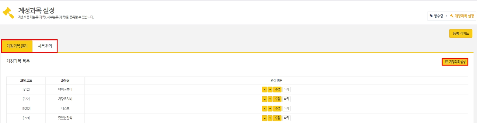 관리자페이지 영수증 - 계정과목 설정