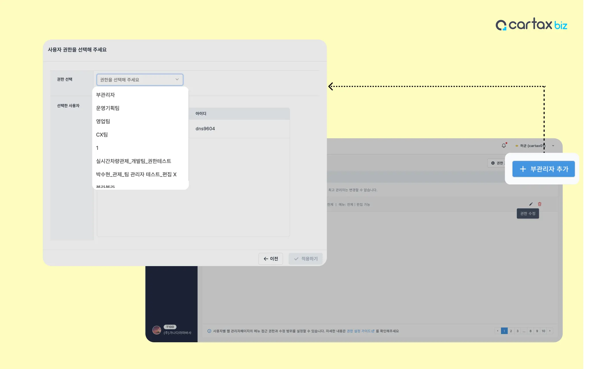 관리자 PC 페이지 → 사용자 → 사용자 권한 설정 → 부관리자 추가