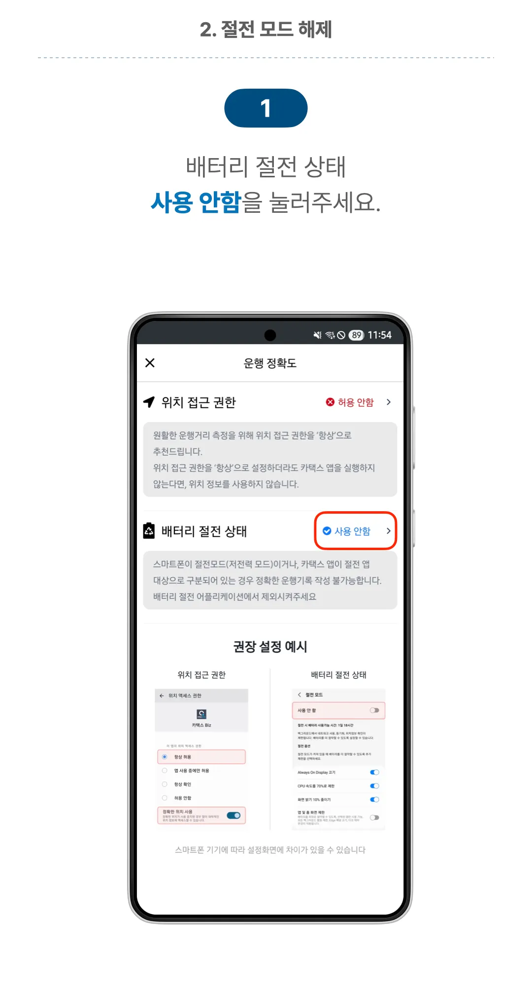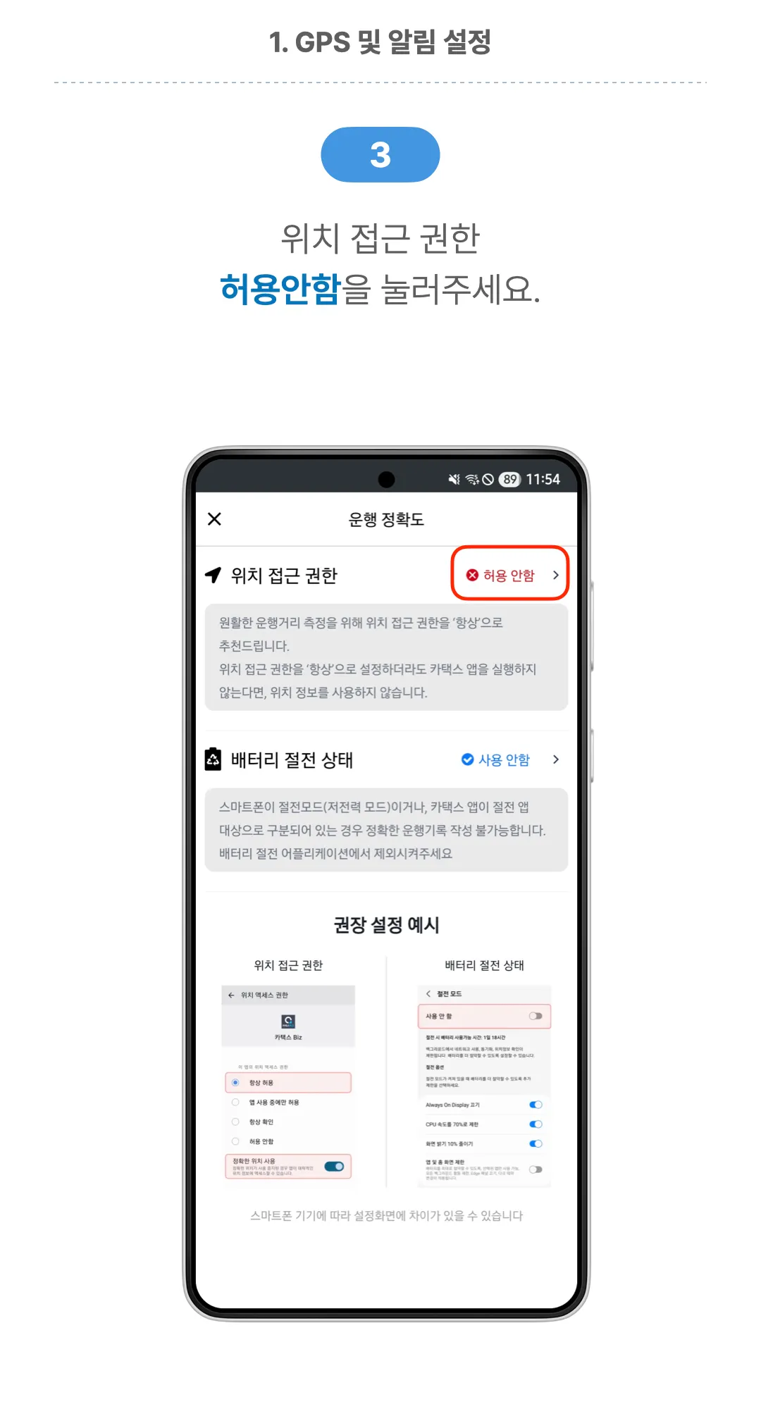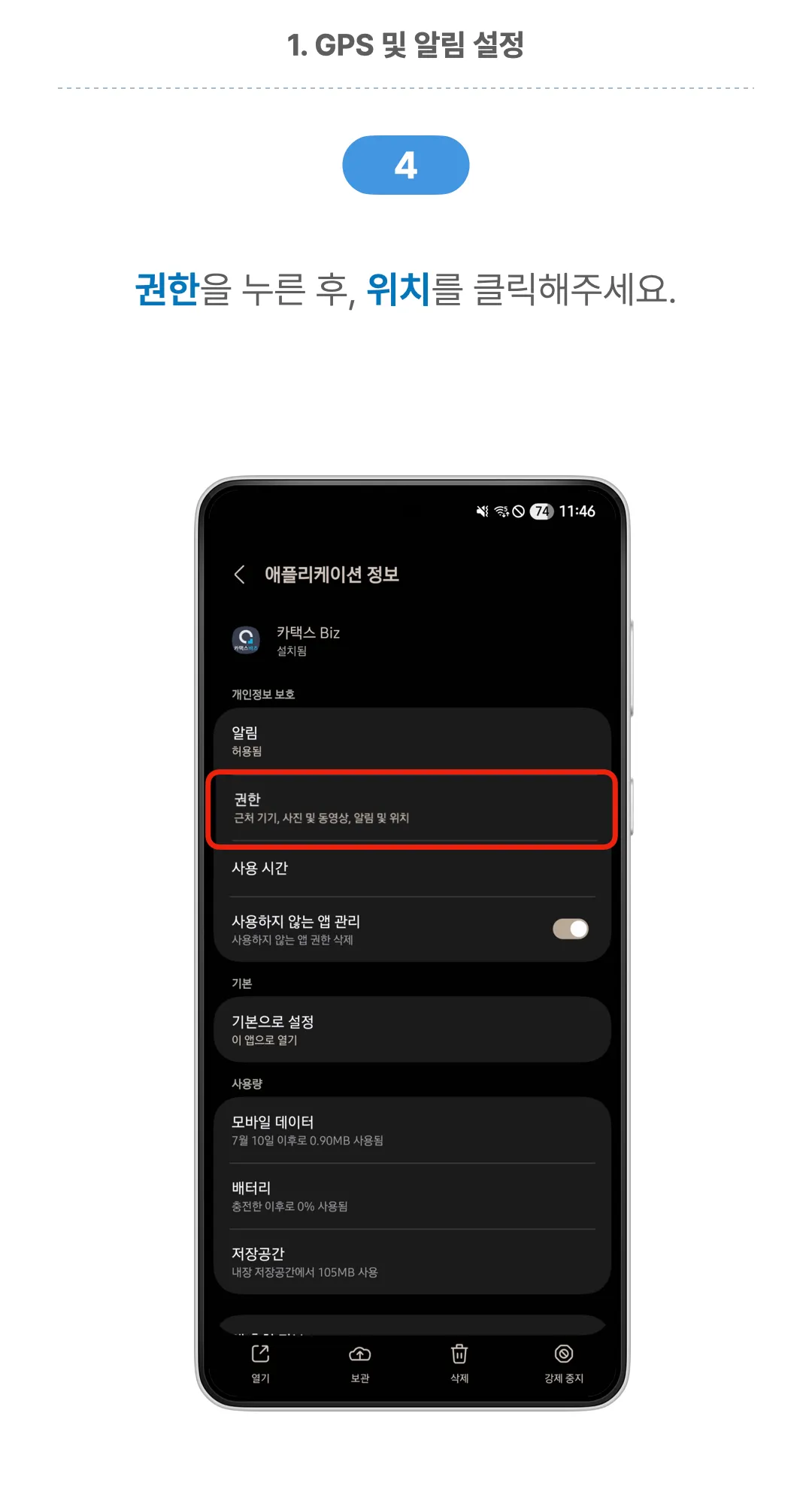 대부분 안드로이드(갤럭시) 기종에서 권한 설정 문제가 많기에 다음의 이미지를 참고해주시기 바랍니다.