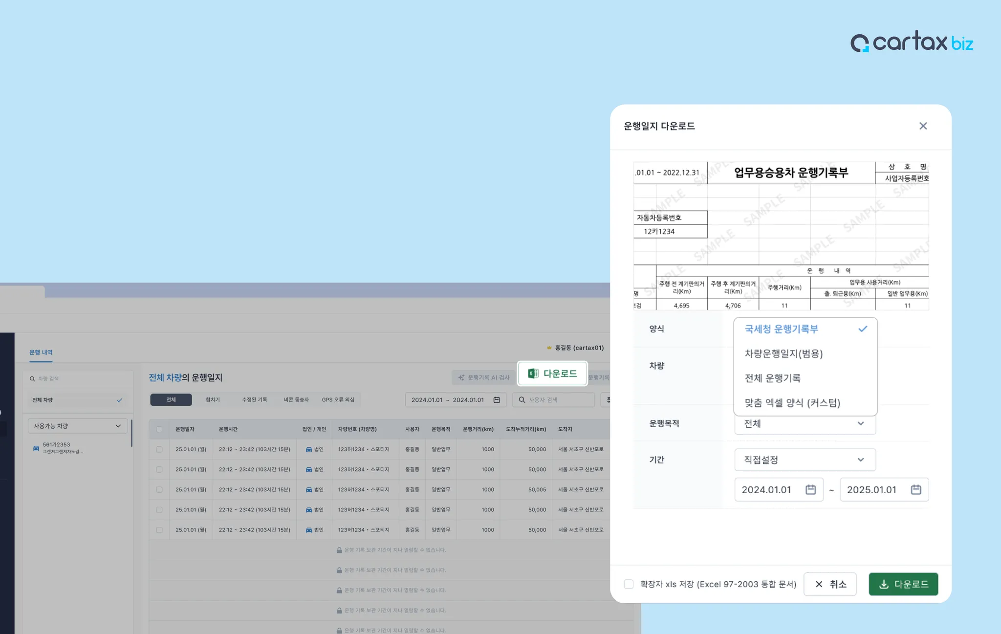 관리자 PC 페이지 → 운행 → 다운로드 → 양식 설정 → 다운로드