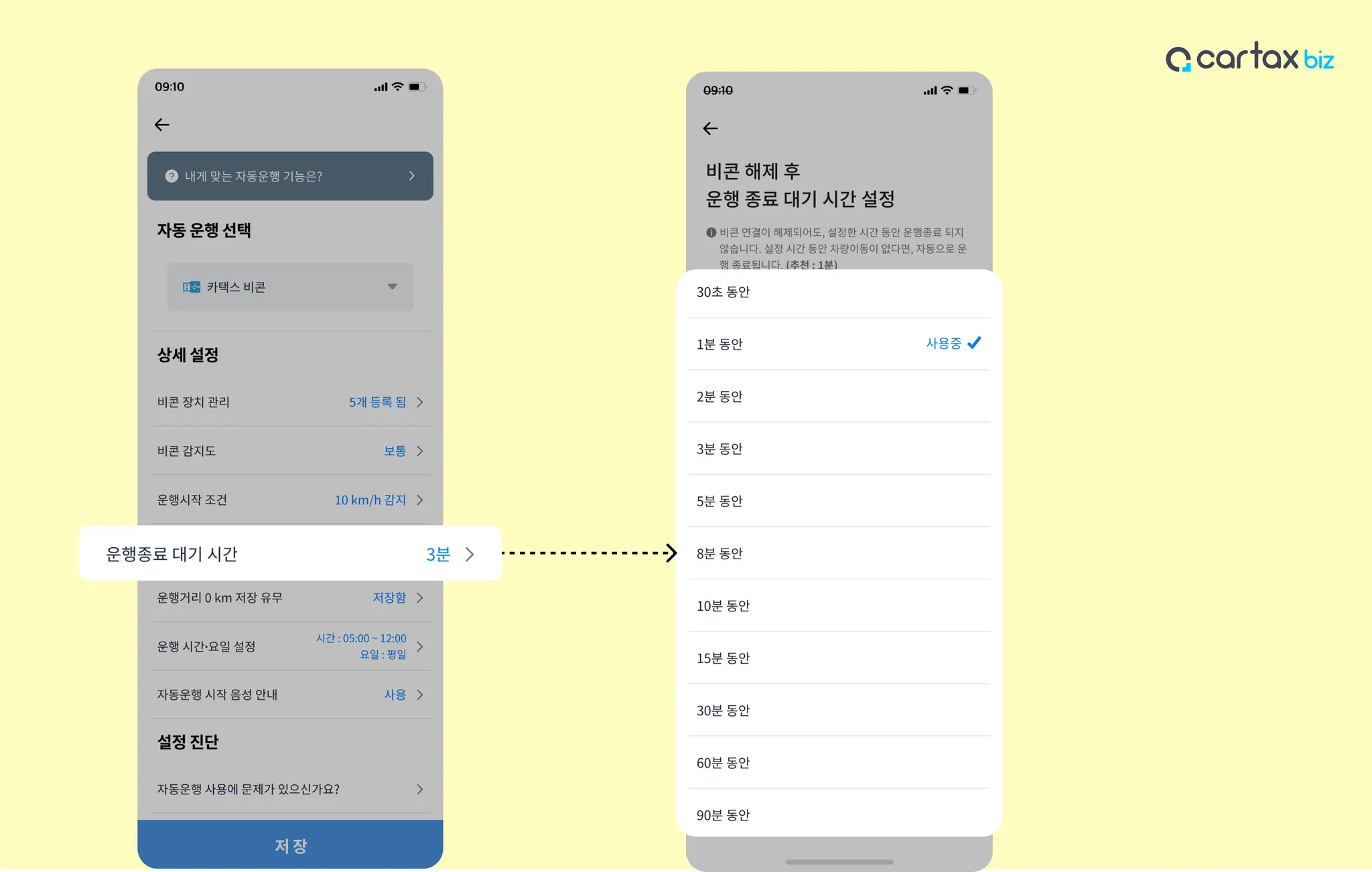 카택스 Biz APP 접속 → 자동운행기록 - [카택스 비콘] 클릭 → 비콘 상세 설정 진입 → 운행종료 대기 시간 변경