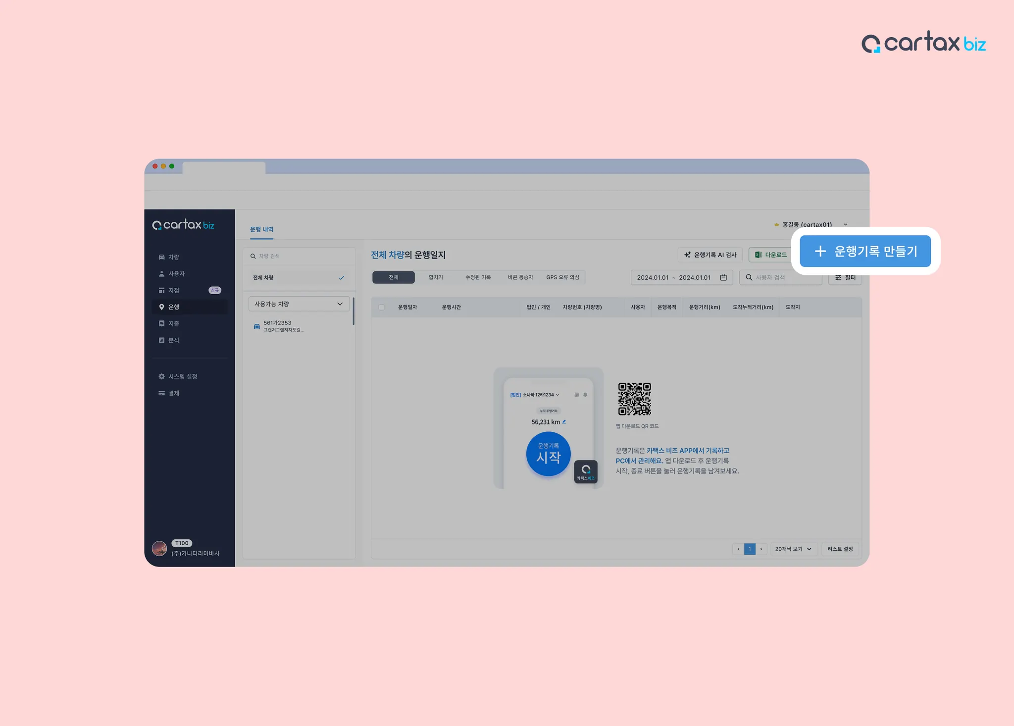 관리자 PC 페이지 → 운행 → 운행기록 만들기 → 운행기록 생성 및 저장