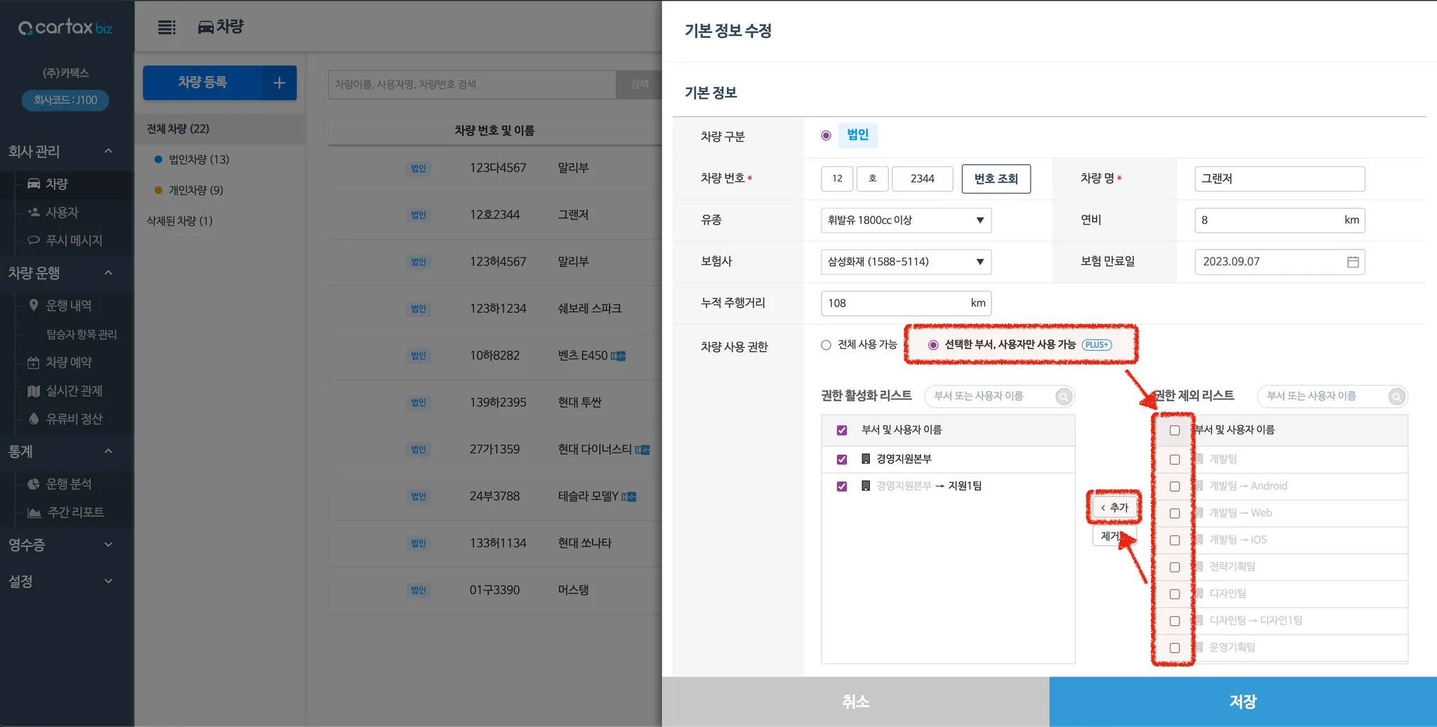 1. 차량 사용 권한 옵션에서 (오른쪽)선택한 부서, 사용자만 가능 항목을 클릭해주세요 |