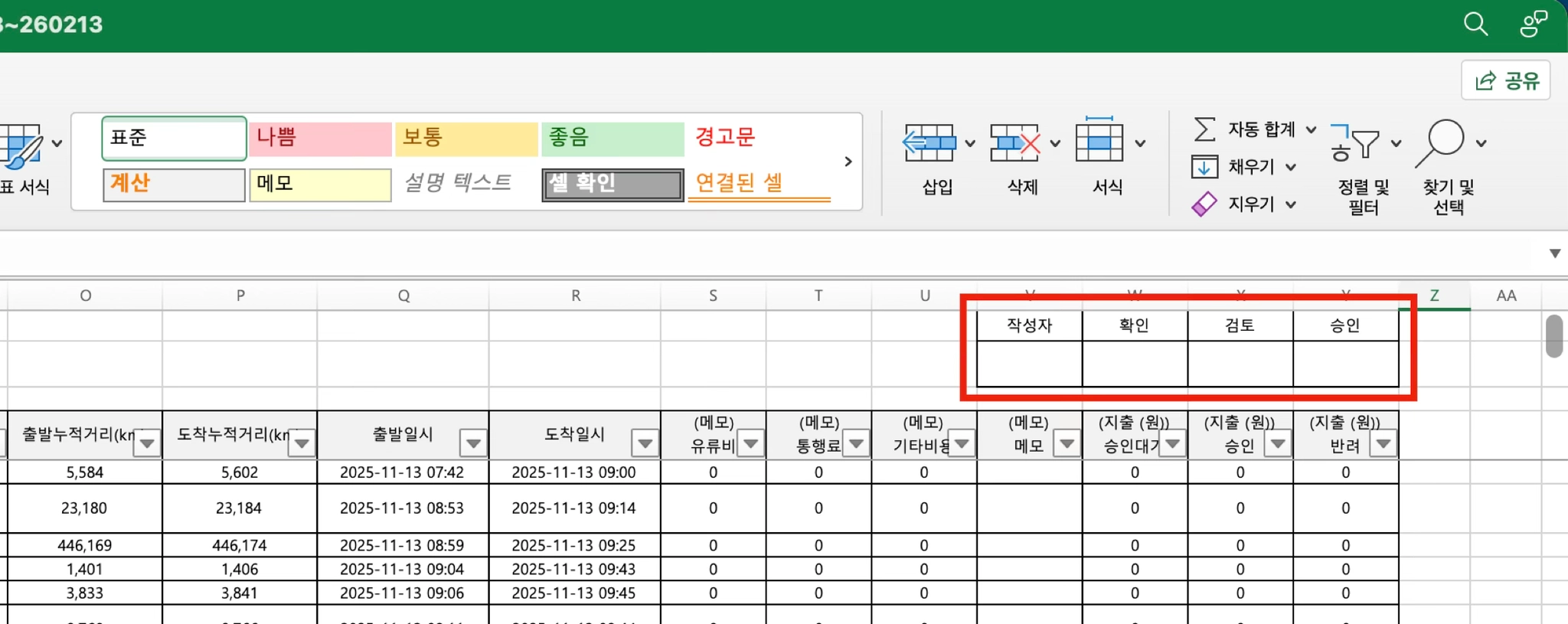 운행기록 다운로드 시 전체 운행기록 양식에서 결재란(작성자, 확인, 검토, 승인)을 포함하여 다운로드할 수 있는 기능입니다.