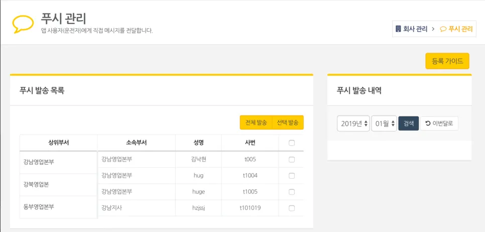 사용법 : 관리자 페이지 접속 → 푸시관리 클릭 → 푸시 발송 인원 선택 → 발송 내용 작성 및 발송