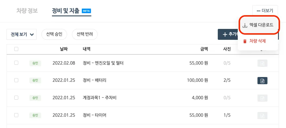 차량관리 → 차량 선택 → 우측상단 더보기 → 엑셀 다운로드