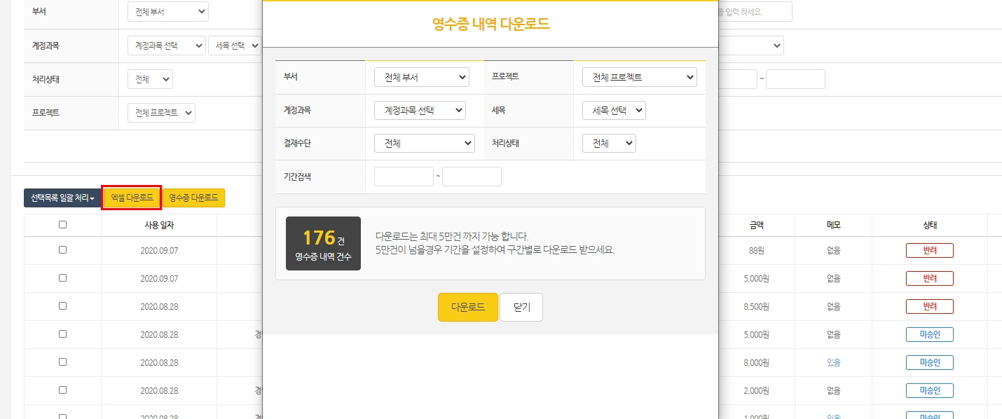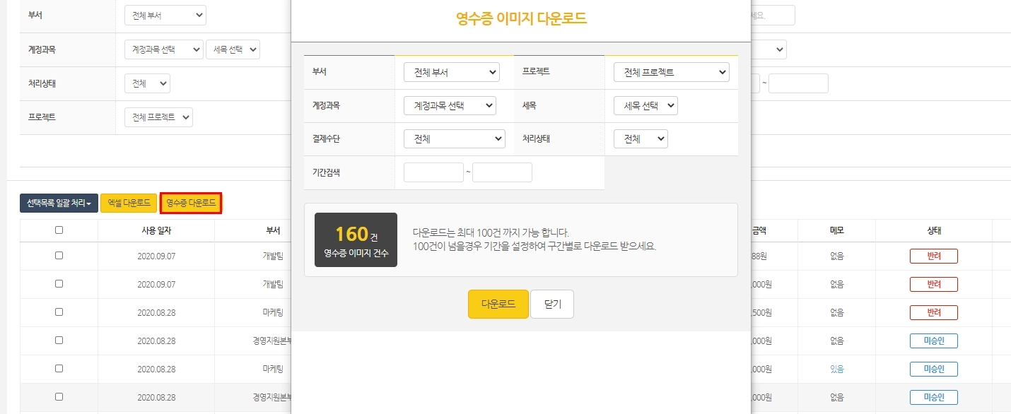 영수증 내역 다운로드시, 부서별/ 프로젝트별/ 계정과목별 등 구분하여 다운로드 가능합니다.