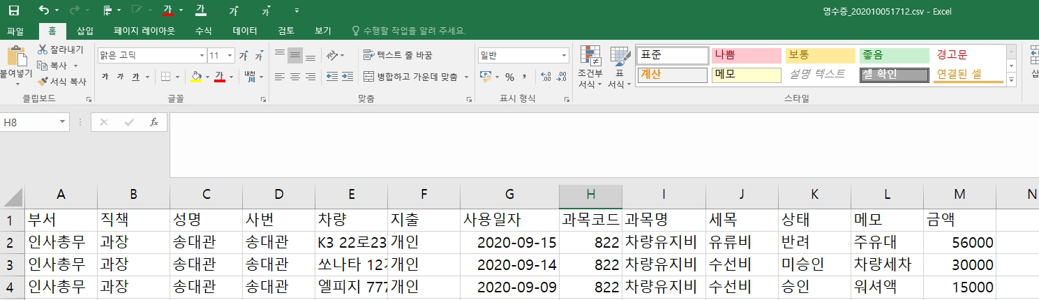 3. 영수증의 제목은 영수증 기안올린 날짜와 지출항목, 코드, 직원이름 입력되어,