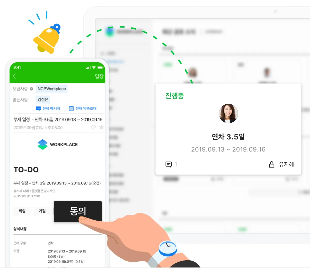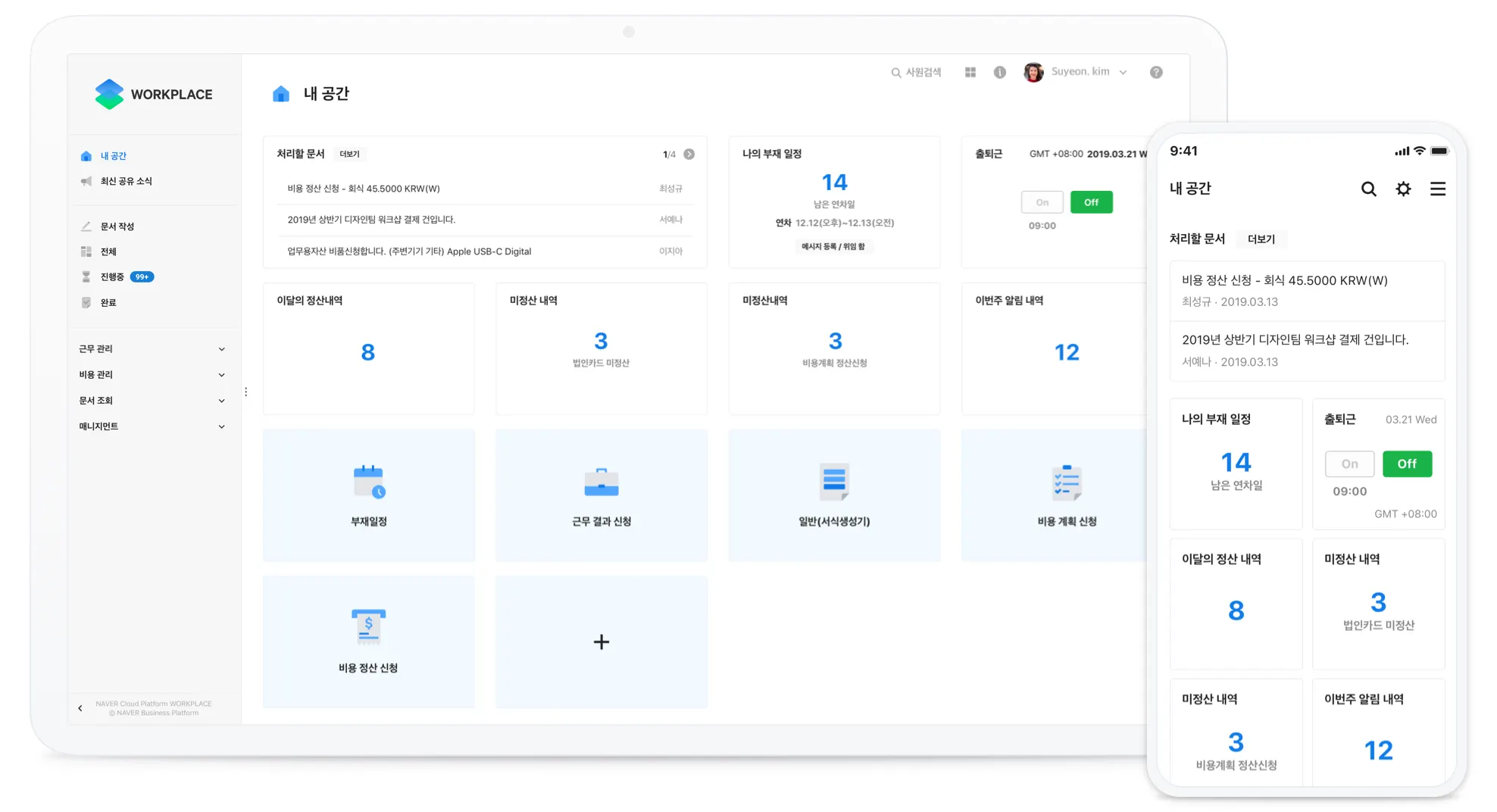 네이버 클라우드 플랫폼 WORKPLACE는 국내 근로기준법과 기업회계기준을 준수하여, 구성원, 결재, 근태, 비용, 회계 등의 기능을 PC 웹 및 모바일 앱에 통합 제공하는 클라우드 기반의 스마트 기업 정보 시스템입니다.
