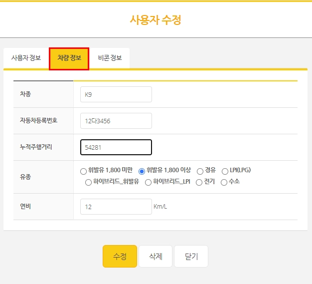 관리자페이지 사용자 관리 → [사용자 클릭] → [차량 정보 수정] → 연비 입력