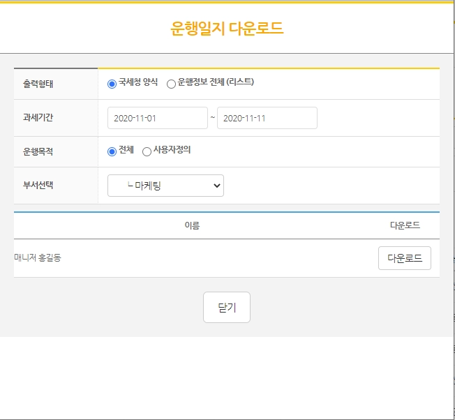 관리자페이지 차량운행내역 → 운행기록 다운로드 → 국세청양식 선택