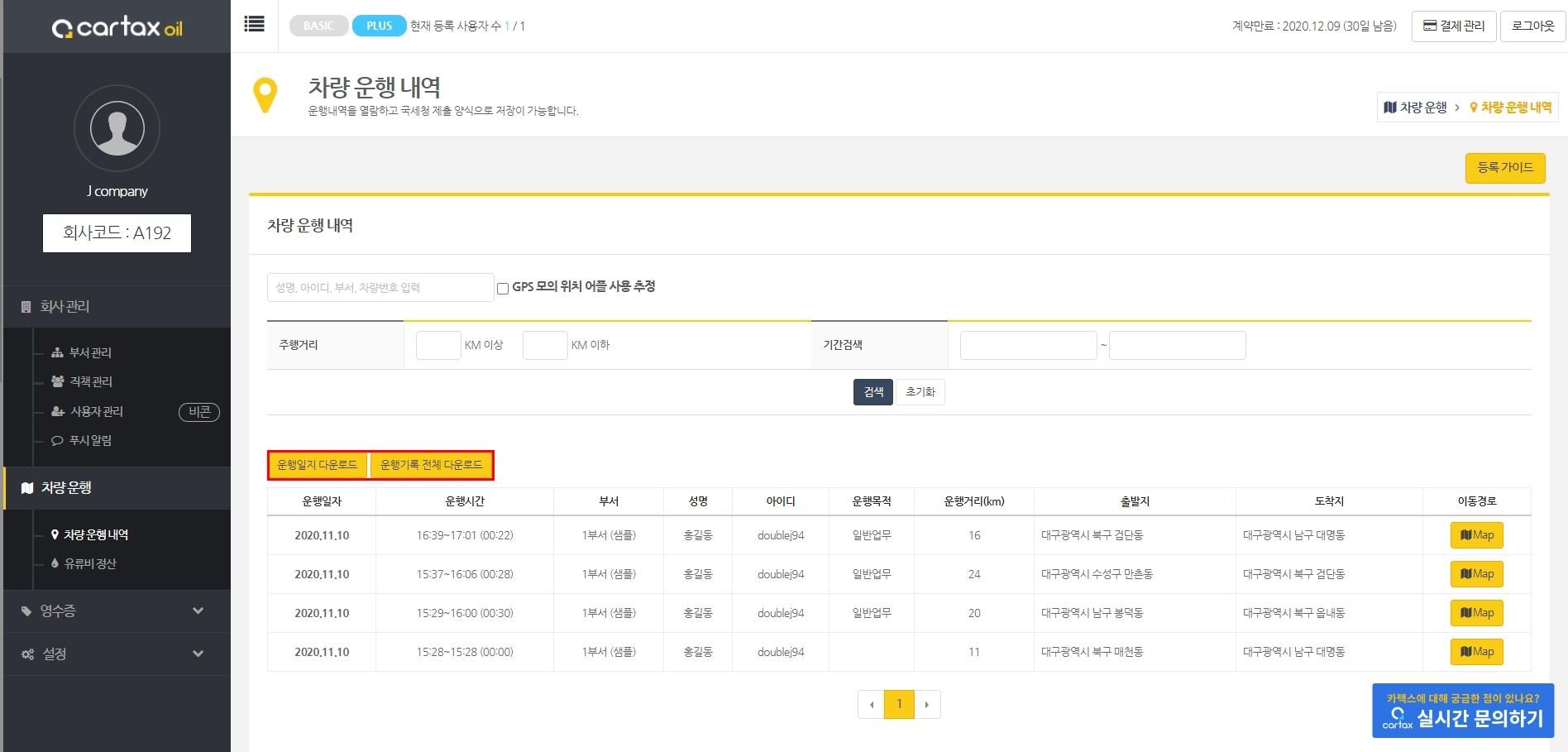 차량운행내역에서 보여지는 모든 운행기록 데이터는 다운로드 가능합니다!