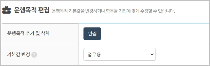 운행목적 편집 기본 제공되는 운행목적 이외에 운행목적을 만들어보세요! 우리 회사에 맞는 업무목적별 운행기록 관리할 수 있어요.