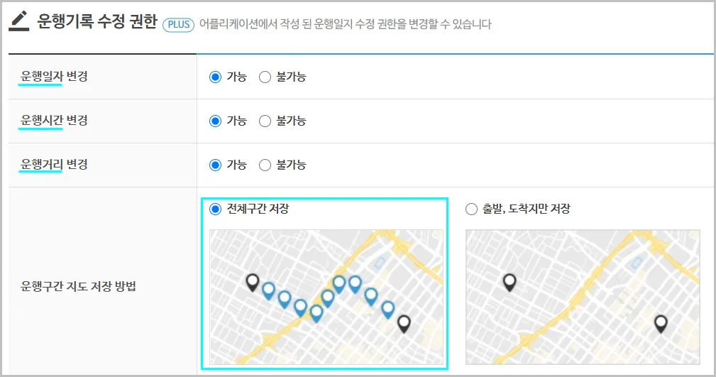 운행 날짜, 시간, 거리에 대해 수정 가능 또는 불가능하도록 설정할 수 있어요.