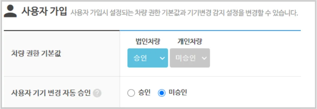 어플 사용자 가입시, 법인차량 및 개인차량 사용여부를 설정해주세요.