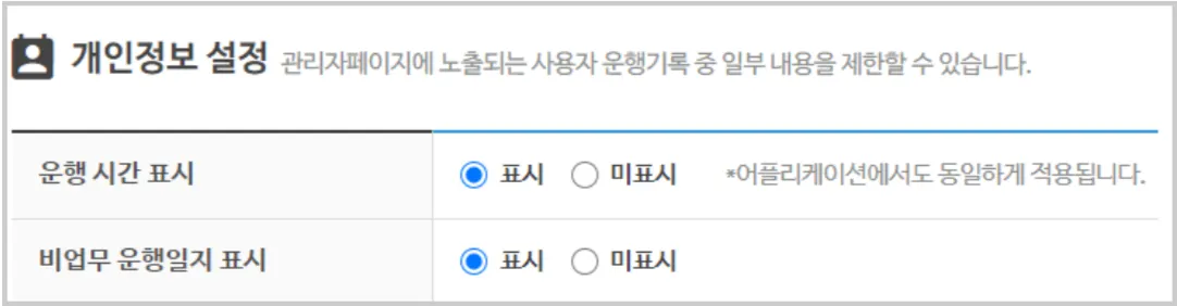 '미표시'로 선택시, 운전자의 어플 및 관리자페이지에서 운행기록에 대한 운행시간 표시되지 않아요.