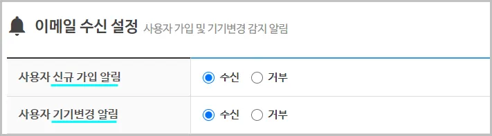 관리자페이지 설정→이메일 수신 설정에서 아래 내용을 확인해보세요.