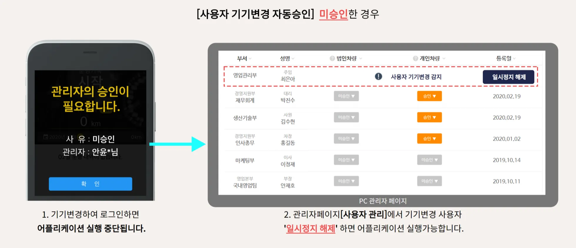 '승인'으로 설정하면, 기기변경 감지되어도 앱 사용 정지되지 않습니다.