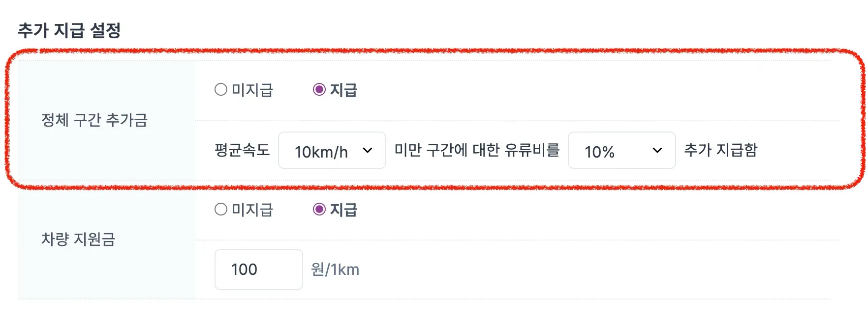 저장된 이동 경로의 좌표간 속도를 활용하여 정체구간에 대한 추가지급을 설정할 수 있습니다.