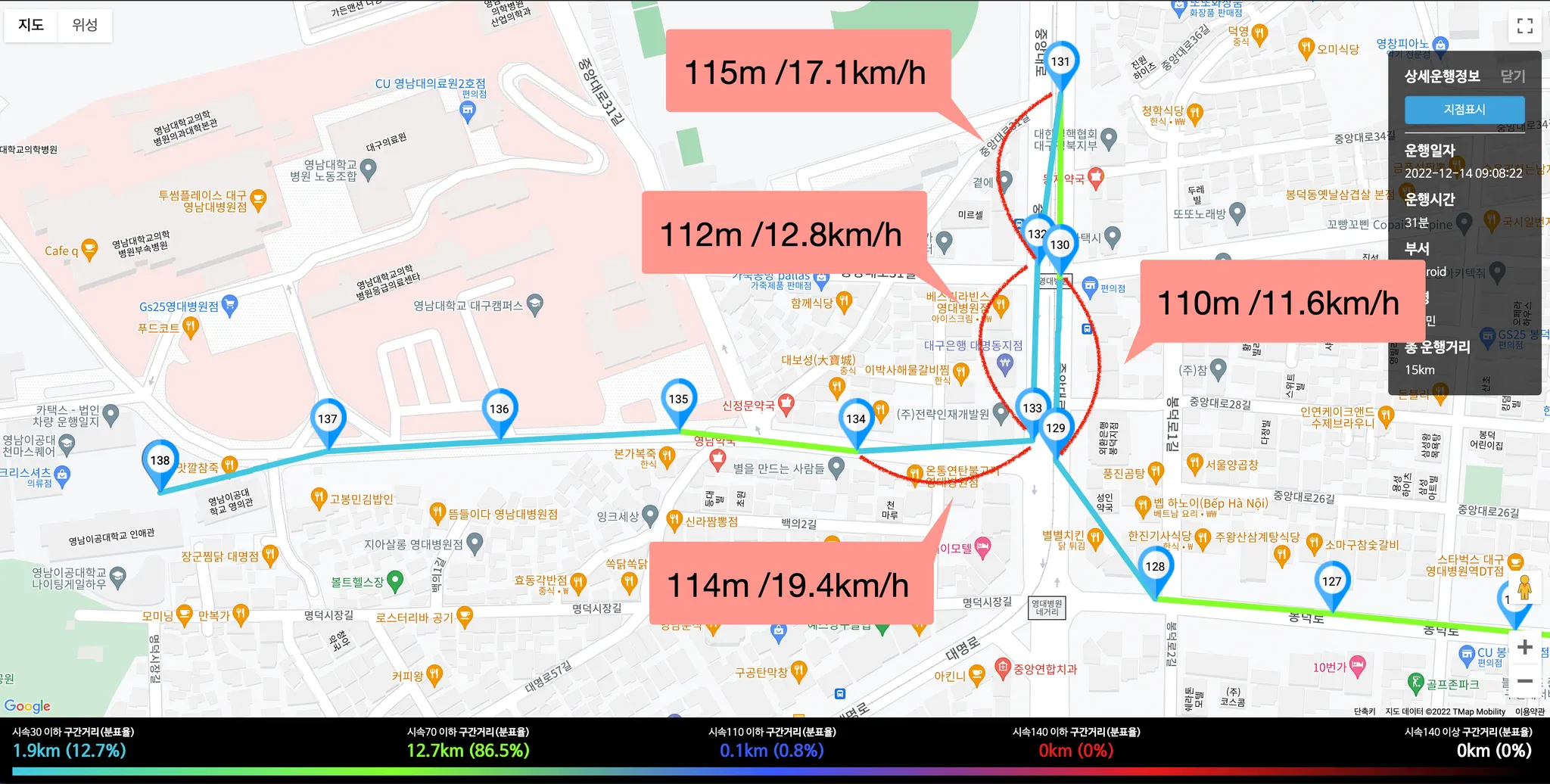 정체구간 집계는 운행기록 작성 시 저장되는 좌표 사이 거리와 시속을 이용합니다.