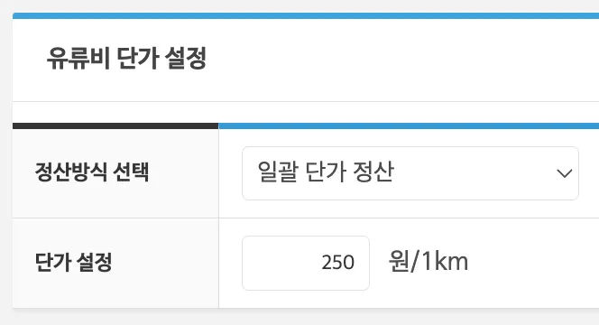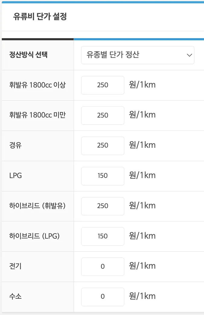 - 차량 유종에 맞게 1km당 단가를 설정할 수 있습니다. |