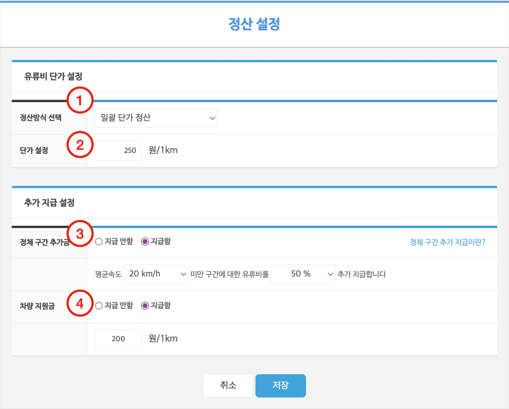 3. 정체구간 추가지급 | 저장된 이동 경로의 좌표간 속도를 활용하여 정체구간에 대한 추가지급을 설정할 수 있습니다.