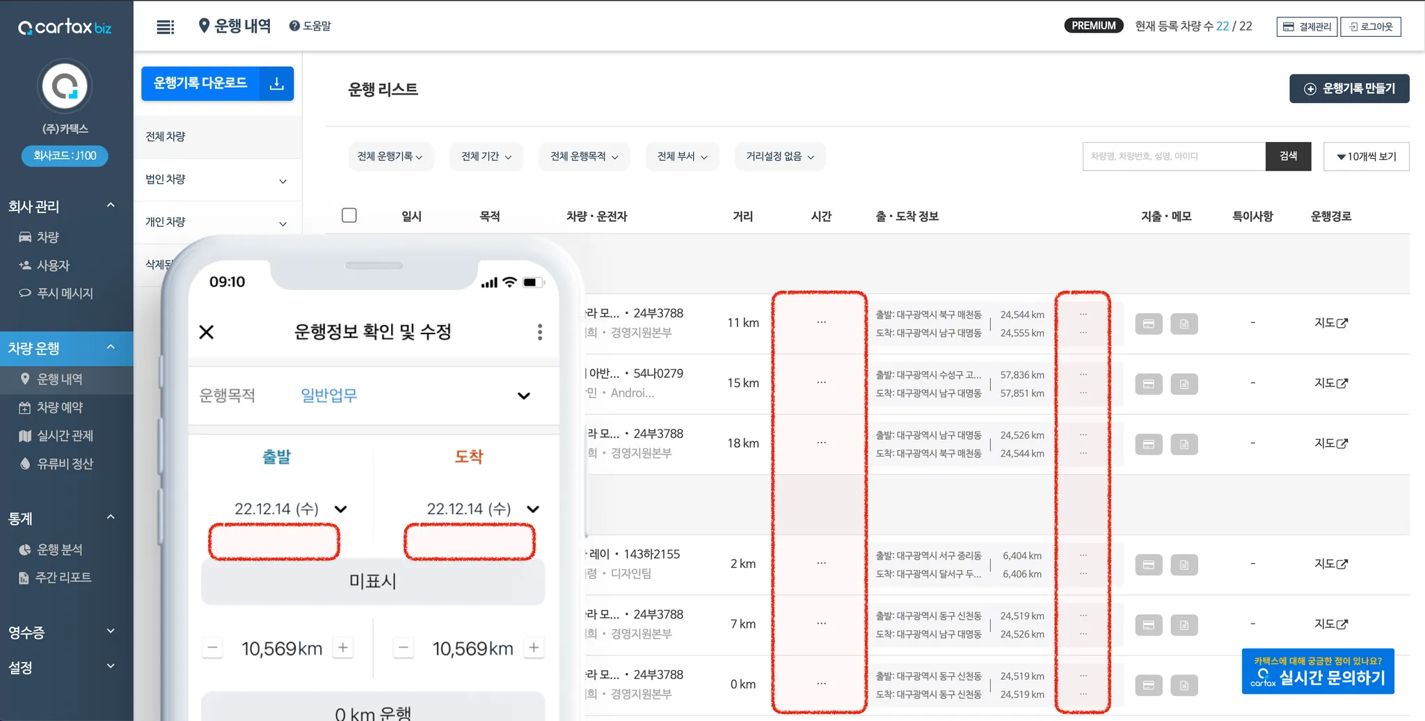 5. 운행 시간 표시 | 작성된 운행기록의 시간 데이터를 표시하지 않습니다 (출, 도착시간, 운행시간)