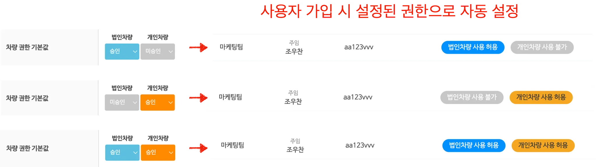 3. 차량 권한 기본값 | 사용자 차량 사용 권한을 설정된 기본값으로 자동 설정합니다. |
