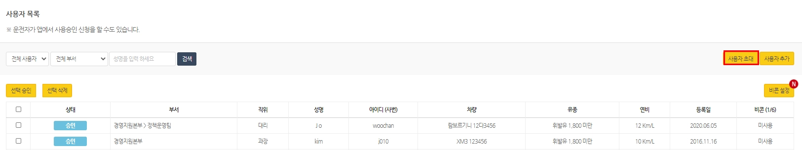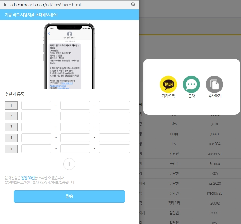 ①관리자페이지 사용자관리→사용자 초대→ 초대메시지 발송