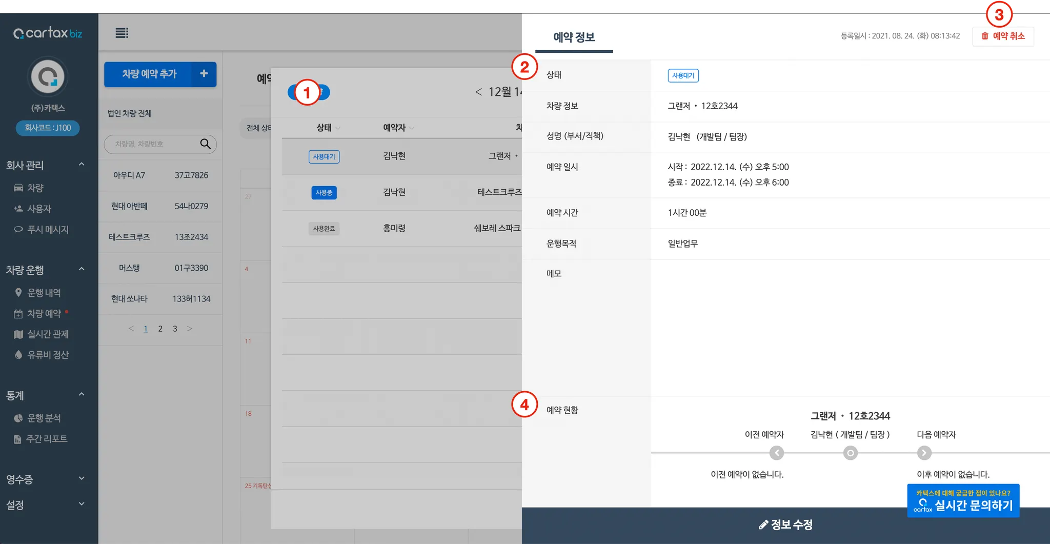 2. 예약 상세 정보 | 예약상태, 차량정보, 예약자, 일시, 시간, 목적 등을 확인할 수 있습니다. |